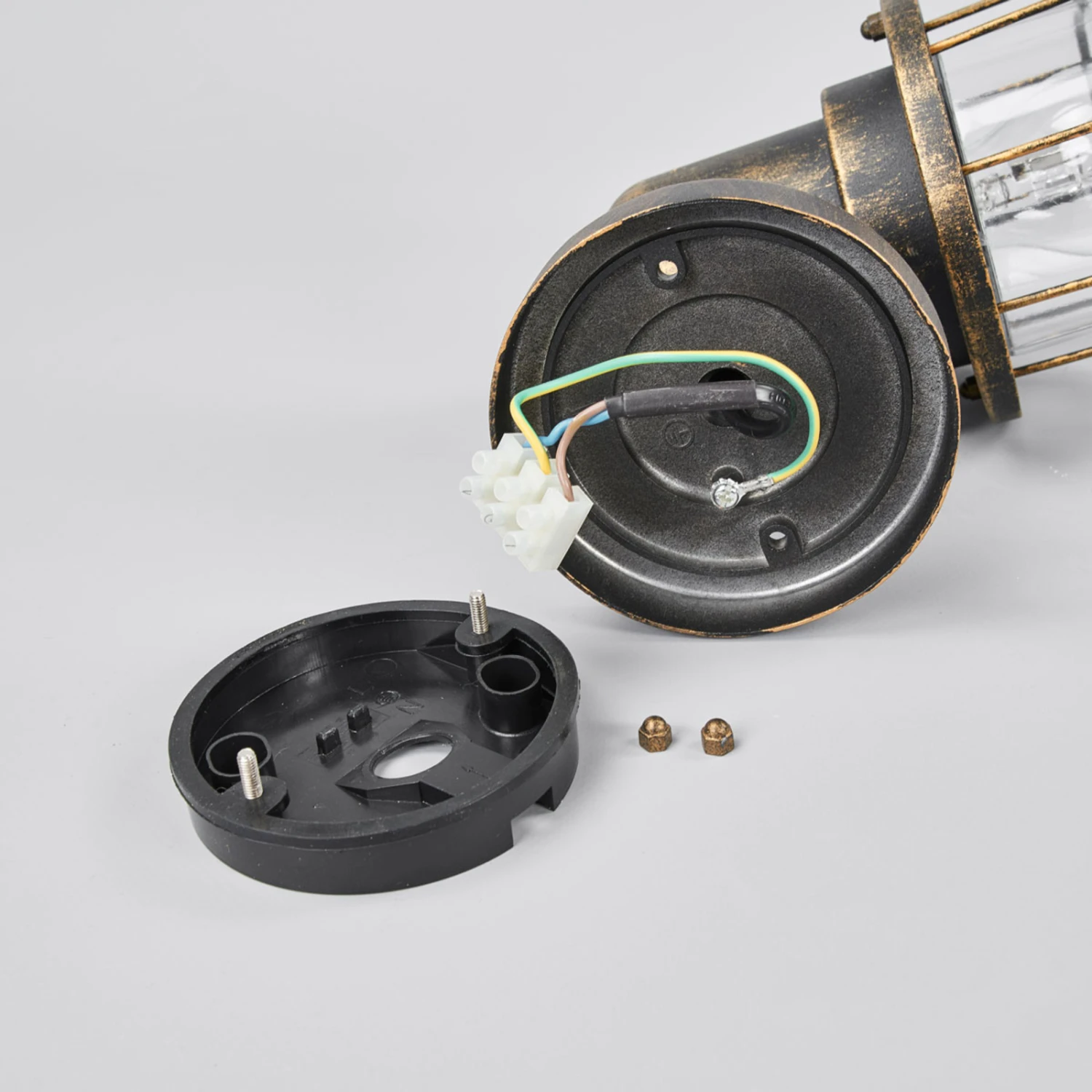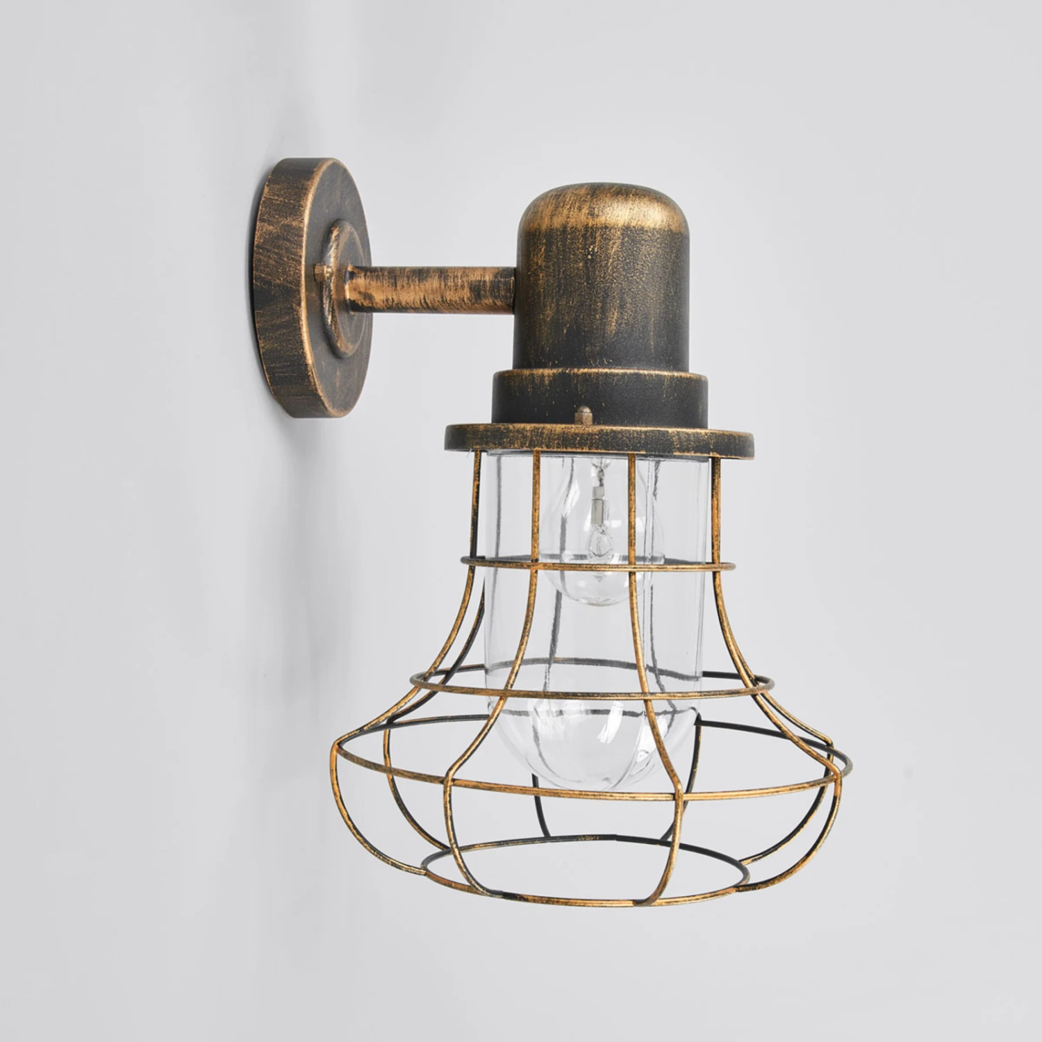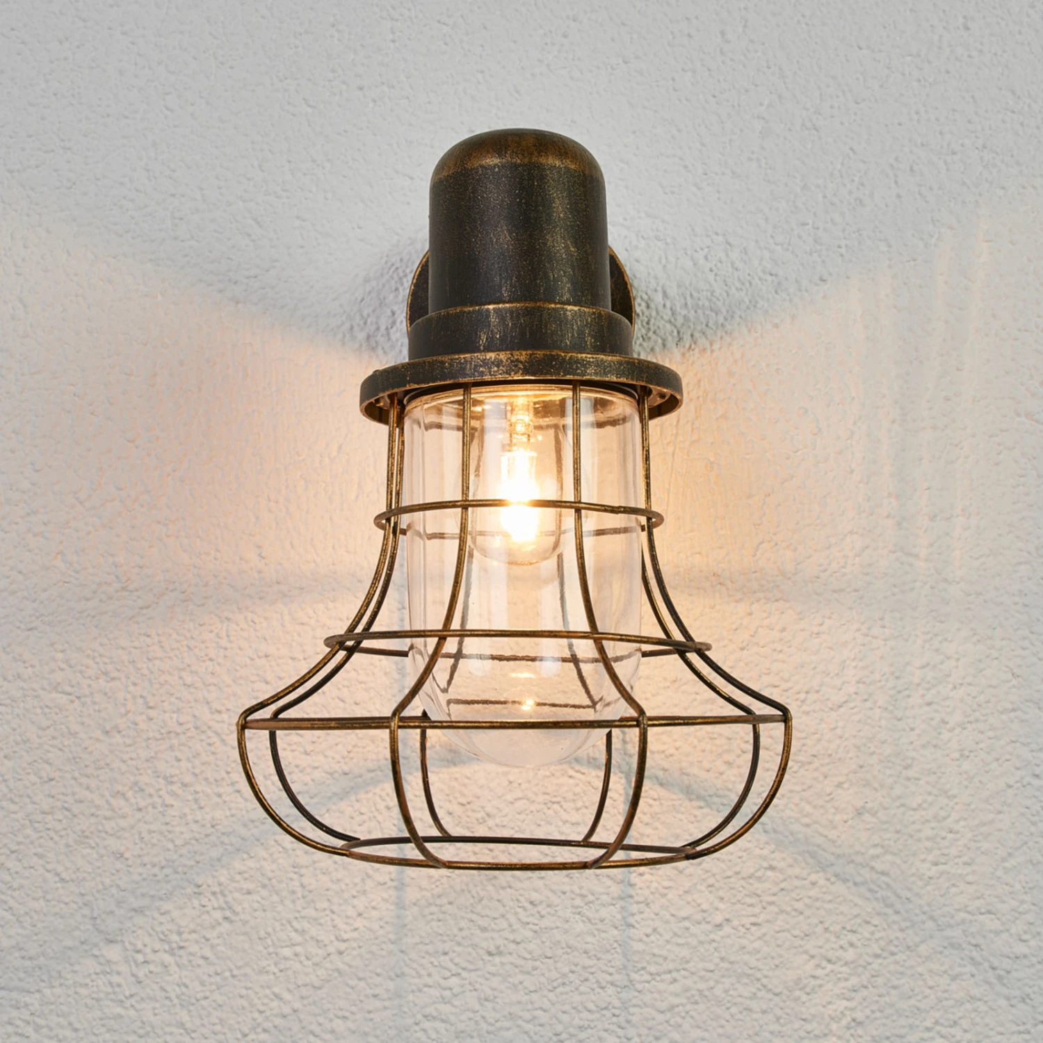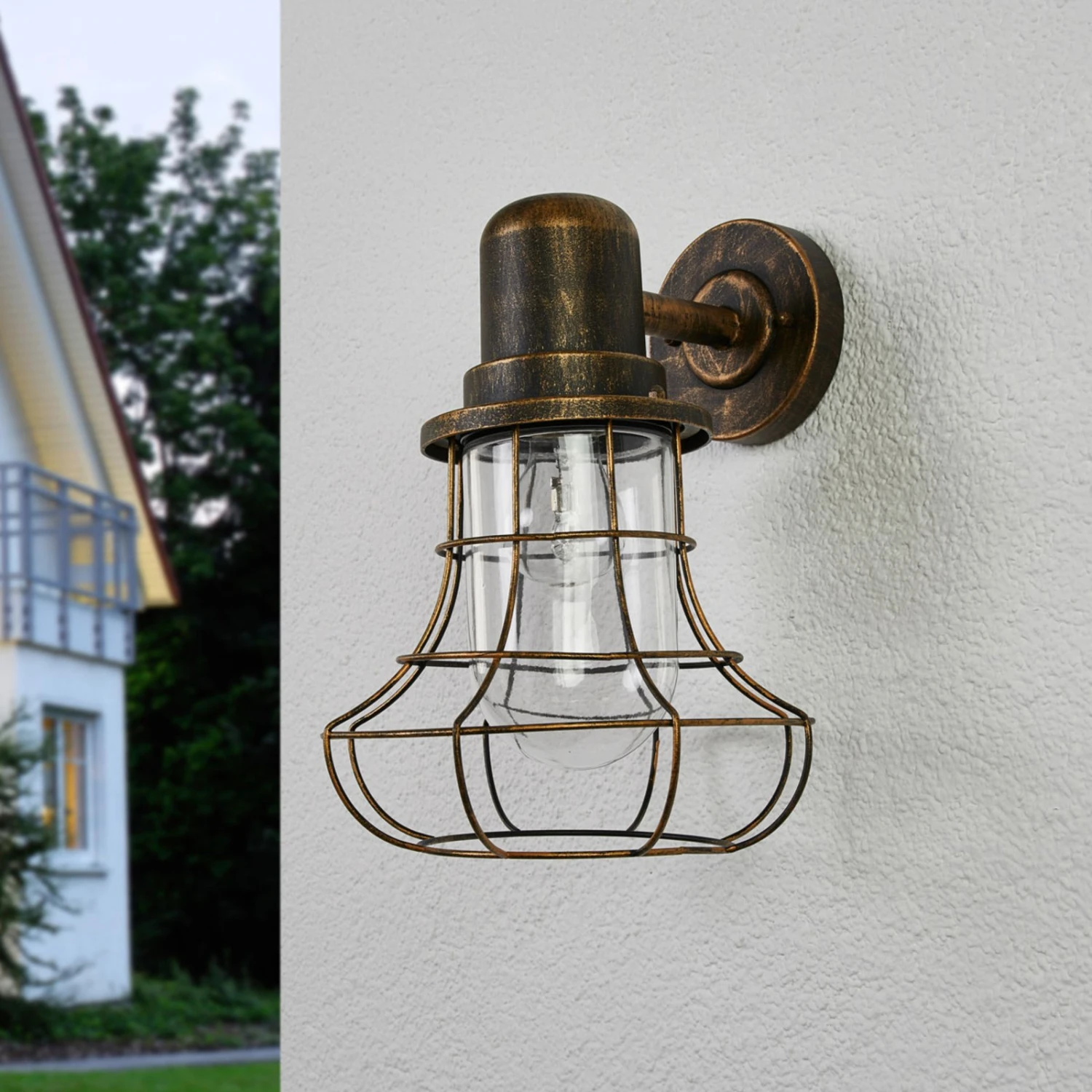 Die Optik sowie die Oberflächengestaltung verleihen der Außenwandleuchte Bird einen antiken Touch. Die Wandhalterung besteht aus Aluminium, das mit einem braungoldenen Finish versehen wurde. Das klare Leuchtenglas wird von einem Käfigschirm umgeben, der nicht nur das Leuchtenglas schützt, sondern auch für einen individuellen Look sorgt. Das klare Leuchtenglas gewährleistet eine ungehinderte Lichtabgabe in die Umgebung. Empfehlenswert ist, sich bei der Wahl der Lichtquelle für ein dekoratives LED-Filamentleuchtmittel zu entscheiden, das der Leuchte den letzten Schliff verleiht.