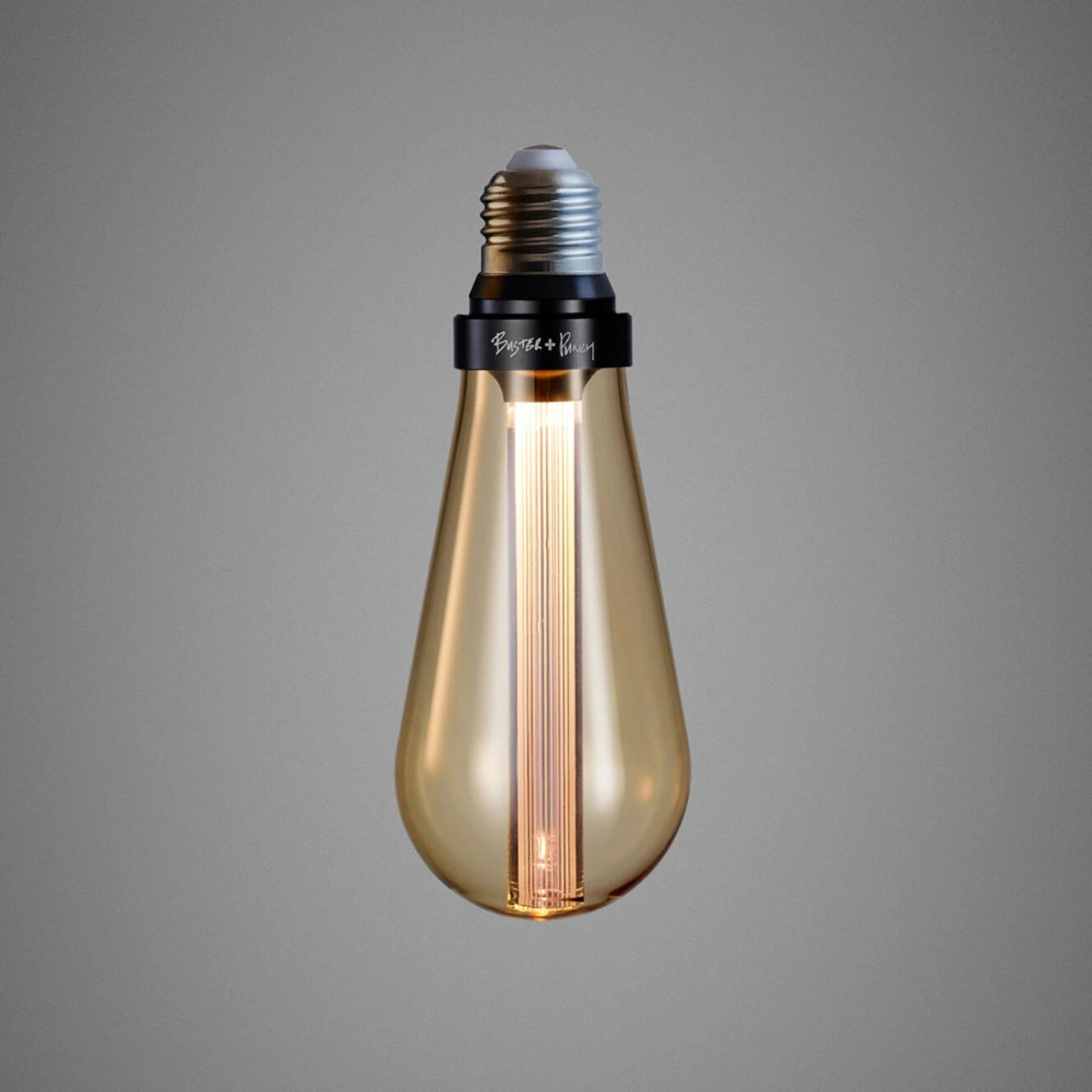 Mit diesem Designer-LED-Leuchtmittel lassen sich speziell offene und schirmlose Leuchten passend bestücken. Der Clou ist der zentrale Harzlichtleiter, welcher das Licht direkt nach unten und dezent zu den Seiten lenkt. Mit dem golden-transparenten Kolben gewinnt die Lampe zusätzlich an Wärme.