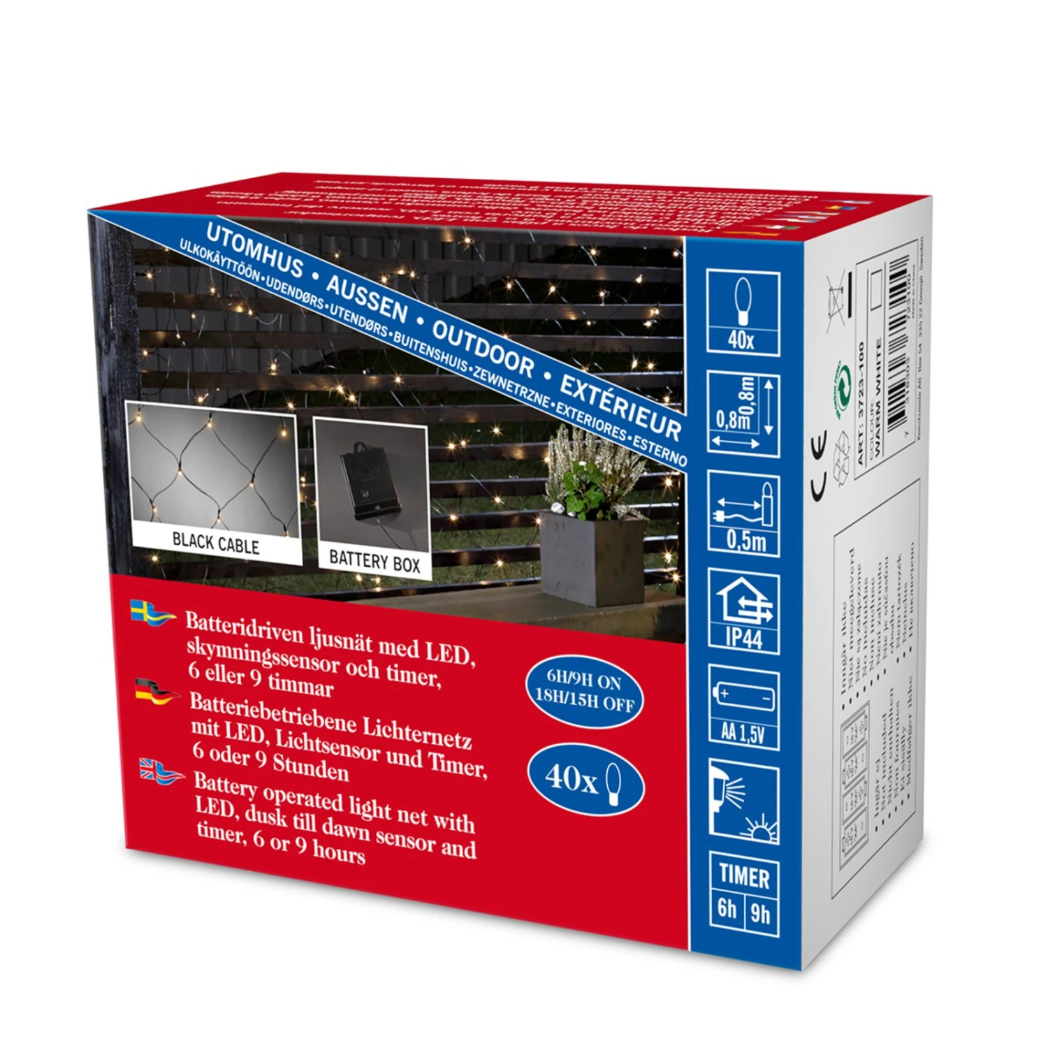 Eine dezente und zugleich sehr wirkungsvolle Außendekoration stellt dieses LED-Lichternetz mit schwarzem Kabel und integriertem Timer für 6 bzw. 9 Stunden dar. Damit lassen sich an der Hausfassade und überall auf dem Grundstück vielfältige Dekorationsideen verwirklichen. Dieser batteriebetriebene Dekoartikel wird von 40 warmweißen LEDs erhellt, ein Lichtsensor ist ebenfalls integriert. Mit Schutzart IP44 ausgerüstet. Es werden 4 x 1,5 V AA-Batterien benötigt. Lieferung exklusive Batterien, sie können über das Zubehör erworben werden.