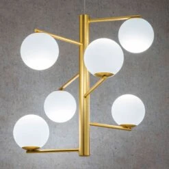 Die Schirme aus weißem Milchglas sind an Metallarmen befestigt. Die Gruppe der unteren drei Schirme ist nach oben orientiert; gespiegelt dazu sind die drei oberen Schirme nach unten ausgerichtet. Auch die Anordnung der zur Mitte hin länger werdenden Arme nimmt das Motiv der Spiegelsymmetrie auf.