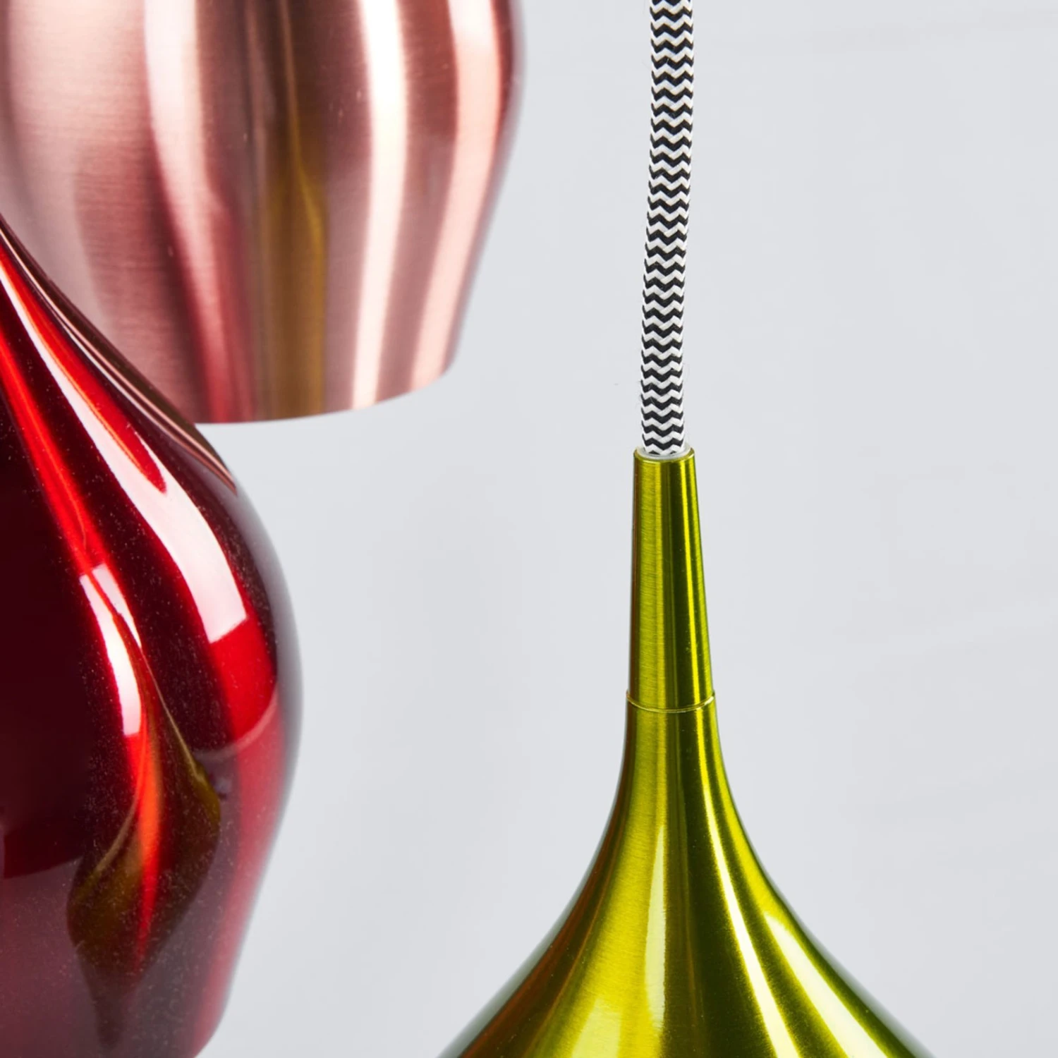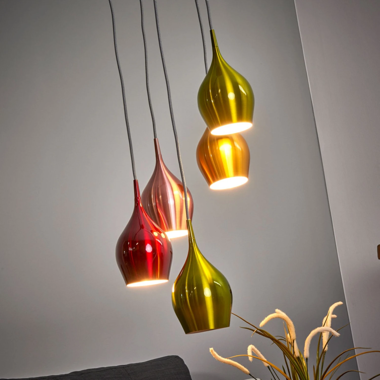 5-flammige Hängeleuchte Vibrant begeistert mit farbigen Aluminium-Schirmen