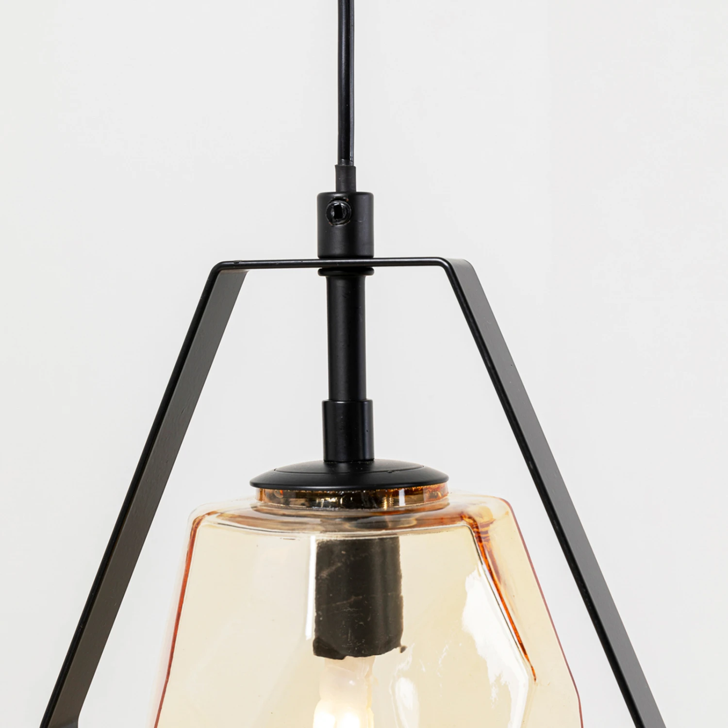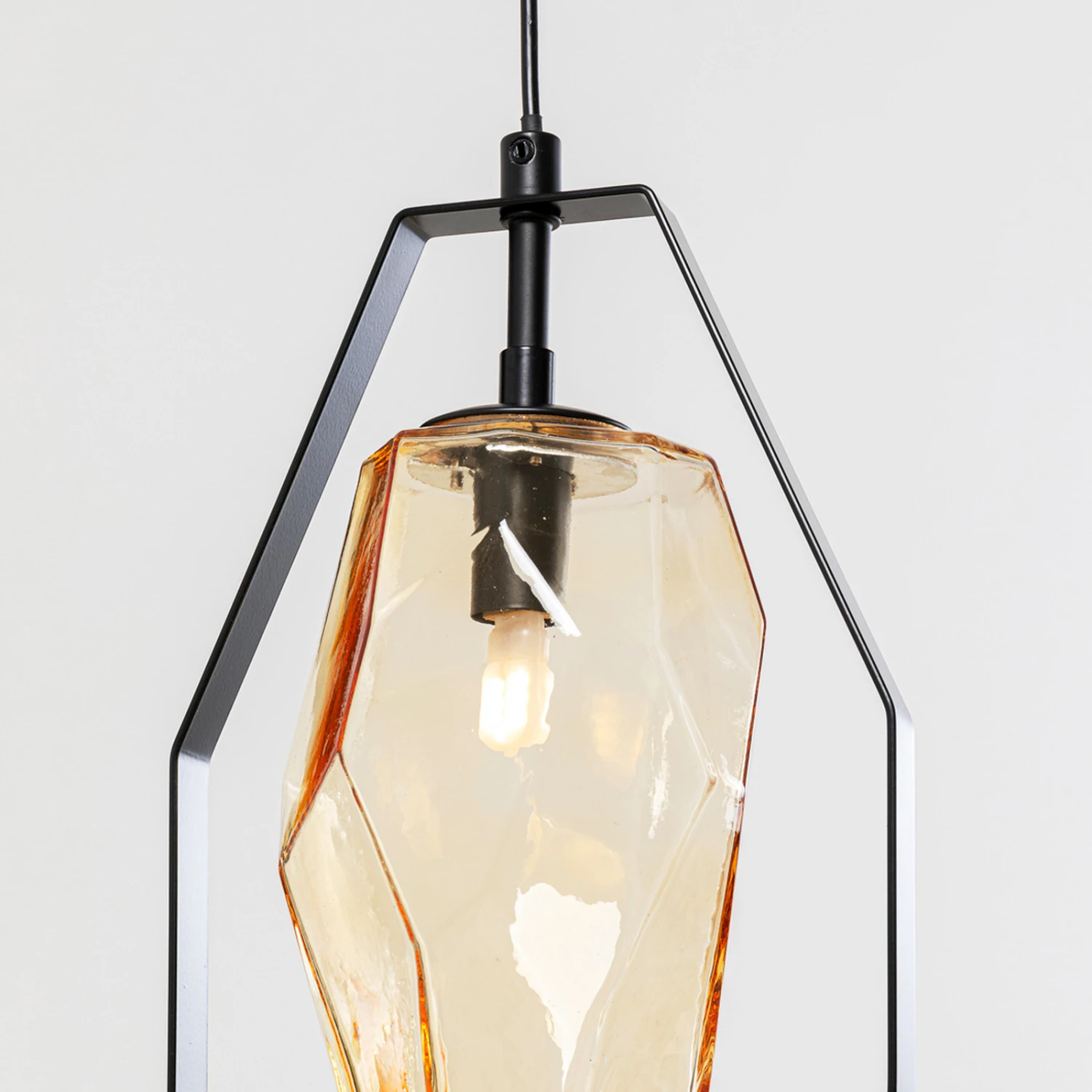 Vom langen Baldachin der Hängeleuchte Diamond Fever Dining hängen in gleichmäßigem Abstand die fünf Leuchten ab. Diese bestehen aus einem getönten Glasschirm, der optisch wie ein geschliffener Diamant geformt ist, einer darin sitzenden G9-Fassung und einem schmalen Rahmen aus Metall, der den gesamten Schirm einrahmt. Der lange Baldachin und die Metallrahmen und Fassungen wurden im gleichen Farbton gestaltet, die Schirme sind teils grau, teils amberfarben getönt.