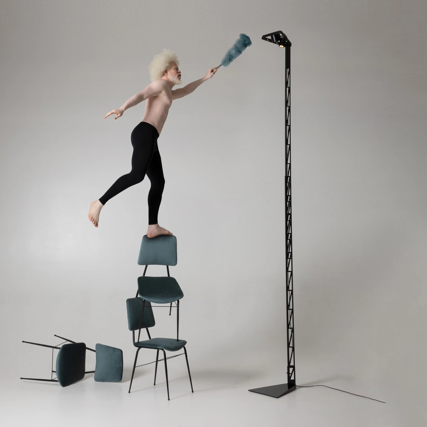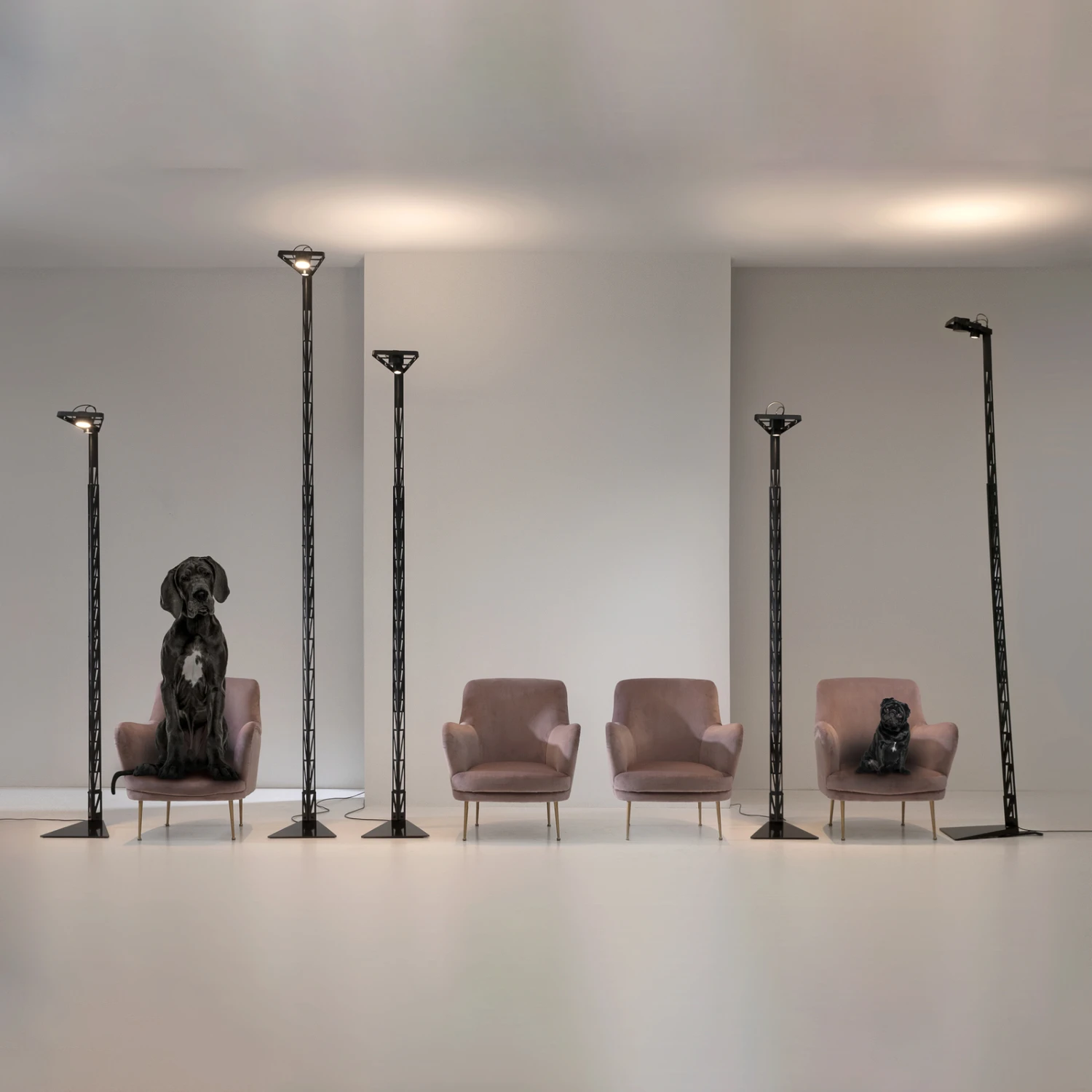 Marc Sadler ist es bei der matt schwarzen Stehleuchte Fireman gelungen Funktionalität und Design zu einem besonderen Beleuchtungsobjekt zu vereinen. Hier gibt der Name einen Hinweis auf die Inspirationsquelle: Das Aluminiumgerüst ist der Drehleiter eines Feuerwehrautos nachempfunden und soll an New York’s historische Feuertreppen erinnern. Die ausziehbaren Profile lassen sich zwischen 215 und 325 cm verstellen.