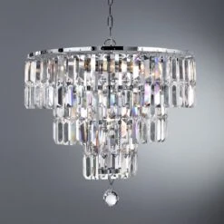 Eine moderne Interpretation eines Kronleuchters mit funkelndem Behang in Form von Kristallprismen, die auf drei Ebenen an einem verchromten Rahmen hängen – das ist die Hängeleuchte Empire. Drei Ringe, jeweils bestehend aus einzelnen Kristallprismen, die zu zweit aneinander gereiht wurden und terrassenförmig am runden Gestell aufgehängt wurden, bilden den Schirm dieses funkelnden Lichtspenders. Den Abschluss unterhalb des dritten, kleinsten Ringes bildet ein geschliffener Glastropfen. Durch Lichtreflexionen und Spiegelungen der Umgebung in den Prismen entstehen funkelnde und schillernde Lichteffekte der besonderen Art.