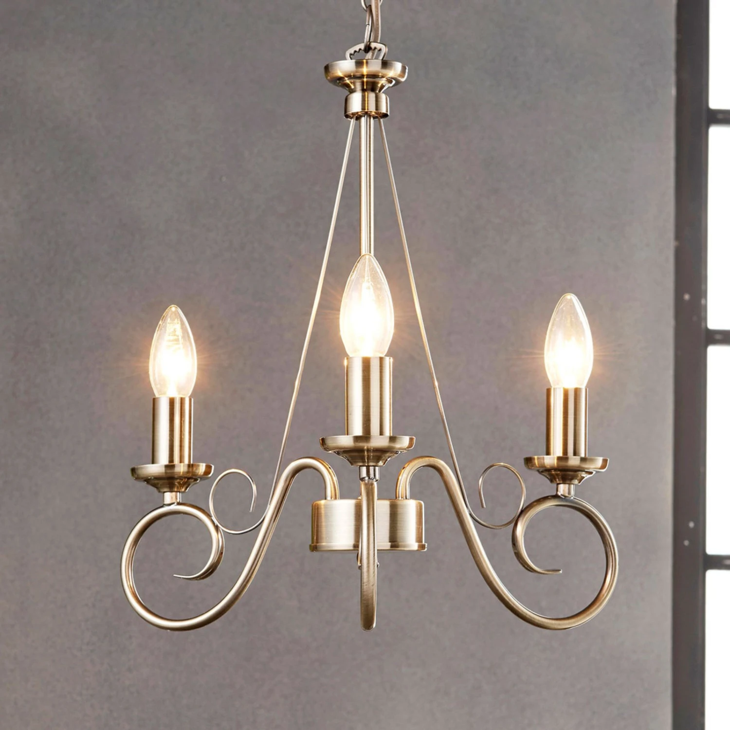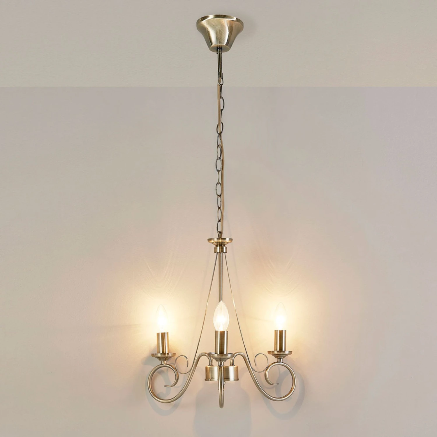 Schöner Altmessing-Kronleuchter Marnia in dreiflammiger Ausführung