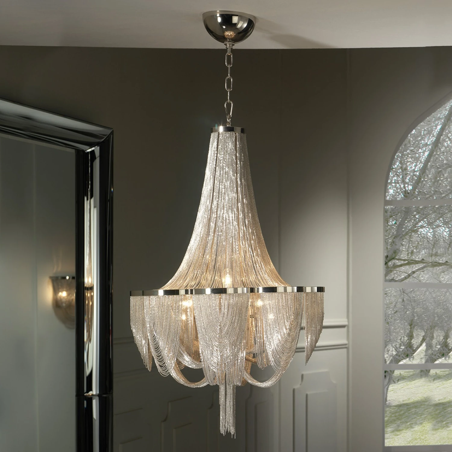 Der glänzende Behang aus filigranen Metallketten verleiht diesem Leuchter eine einmalige Eleganz. Den vollen Glanz entfaltet die Leuchte, sobald die zehn LED-Leuchtmittel eingeschaltet werden, denn dann entsteht ein wundervolles Lichtspiel, was auch in Hotelfoyers oder Restaurants große Begeisterung und ein herrschaftliches Ambiente hervorrufen kann.