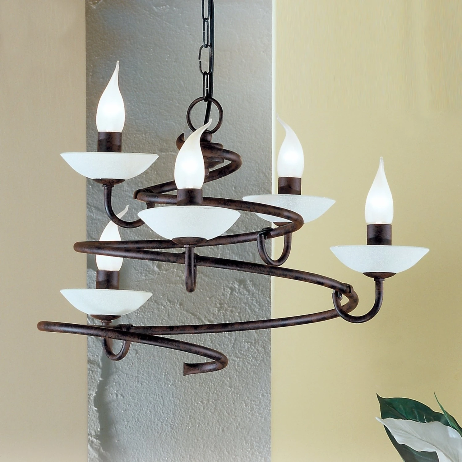5 Kerzenlampen in Flammenform auf einer Metallspirale in antik-brauner Lackierung arrangiert und mit „Tropfschalen“ aus edlem, leicht cremefarben gesprenkeltem Scavoglas kombiniert – das ist durchdachtes Leuchtendesign im trendigen Landhausstil. Ein außergewöhnlicher Kronleuchter für eine stimmungsvolle Beleuchtung.