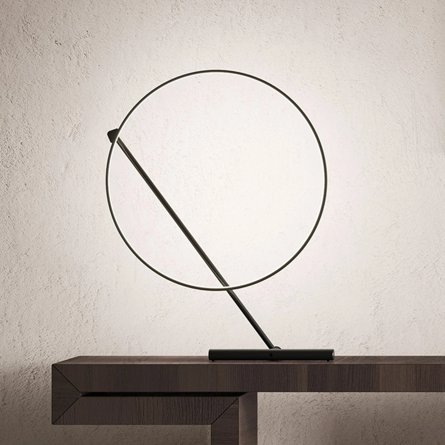 Die Tischleuchte Poise ist schlicht und minimalistisch gestaltet und versprüht einen eleganten Touch. Ihre Form und Lichtwirkung machen sie zu einem zeitlosen Beleuchtungselement, das in zahlreichen Wohnstilen und Bereichen zum Einsatz kommen kann. Bestehend aus einem Kreis, der das Licht nach innen abgibt und einer Stange aus Metall, die in einer Basis in T-Form mündet, verkörpert sie ein graziles Lichtobjekt. Dank ihrer Leichtigkeit erscheint auch die Drehbarkeit um 320 Grad mühelos und verändert auf feine Weise ihr Erscheinungsbild und gleichzeitig ihre Lichtwirkung.