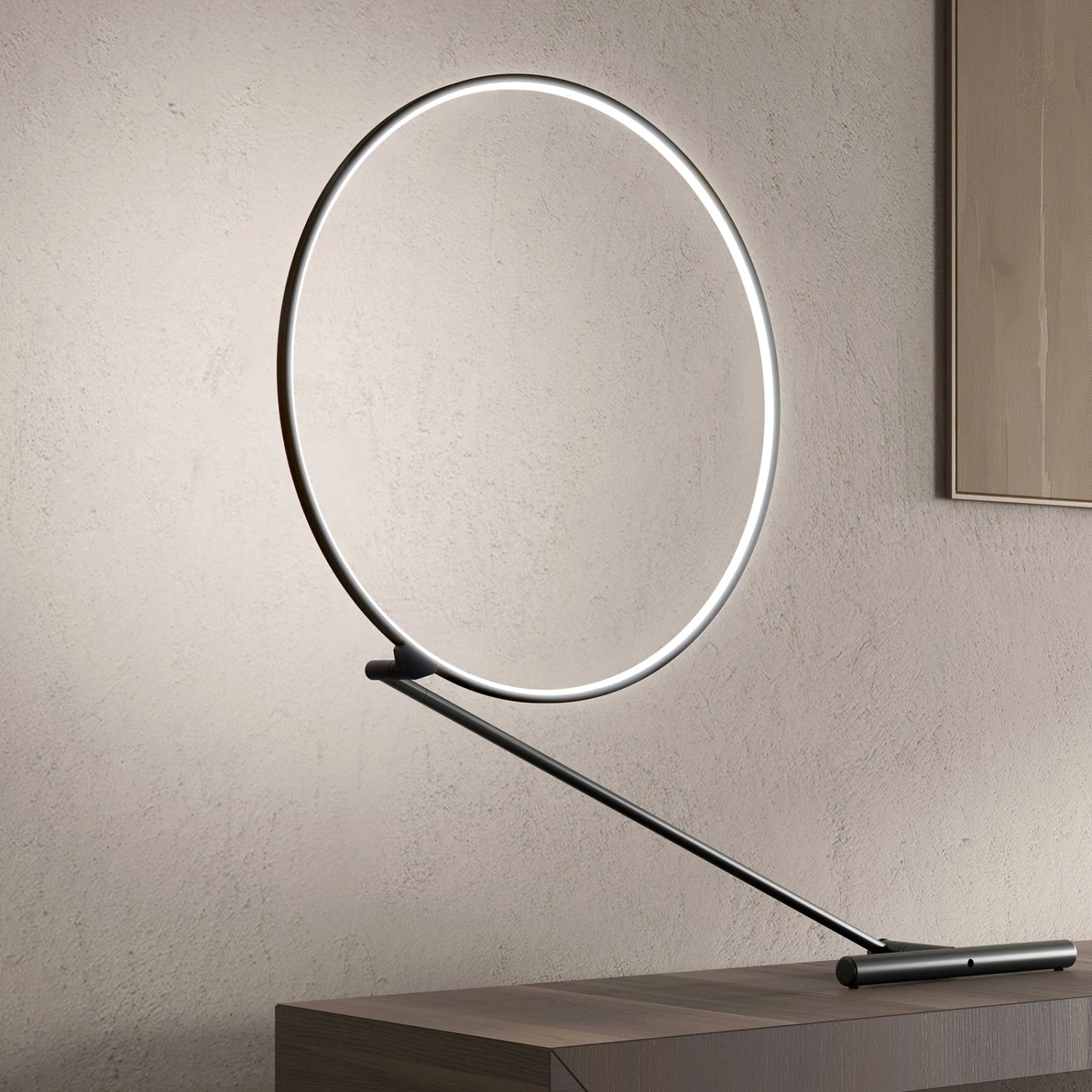 Der Diffusor verläuft an der Innenbahn des Kreises und gibt das Licht der warmweißen LEDs blendfrei an die Umgebung ab. Das Gestell von Poise ist aus mattschwarzem Metall gefertigt und komplettiert die harmonische, moderne Optik. Über einen integrierten Dimmer am Schalter lässt sich die Lichthelligkeit nach Belieben einstellen.