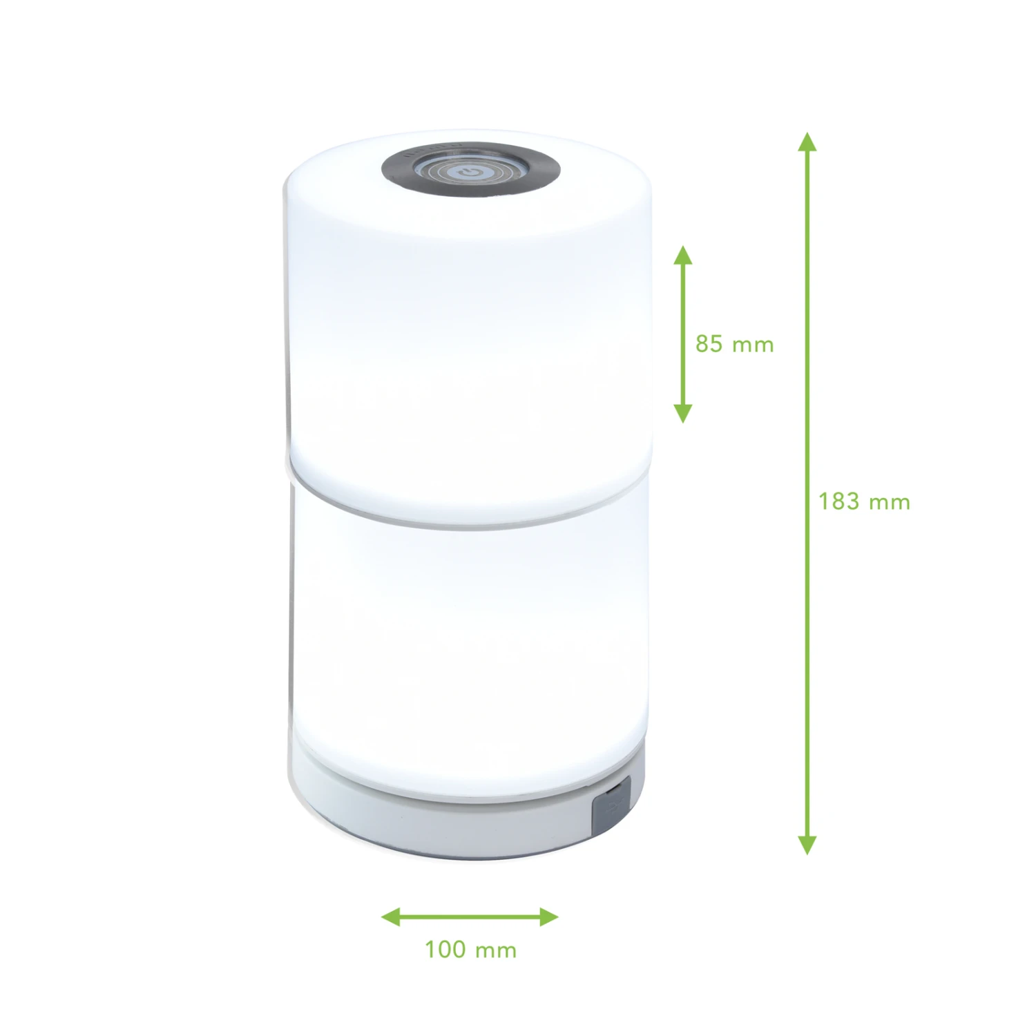 Die LED-Tischlampe Nora ist eine modulare, sphärische Leuchte, die sich perfekt für den Innen- und Außenbereich eignet. Das Starter-Set kommt mit zwei Lichtmodulen und einer Ladestation (inkl. USB-Kabel), sodass die Leuchte direkt aufgeladen werden kann und einsatzbereit ist. Die festverbauten LEDs im Inneren können gedimmt werden und in einer Lichtfarbe von warmweiß bis tageslicht leuchten. Darüber hinaus besitzt Noma eine RGB-Funktion und erzeugt nach Bedarf bunte Farben. Mit einem Erweiterungsmodul lässt sich Noma unkompliziert erweitern.