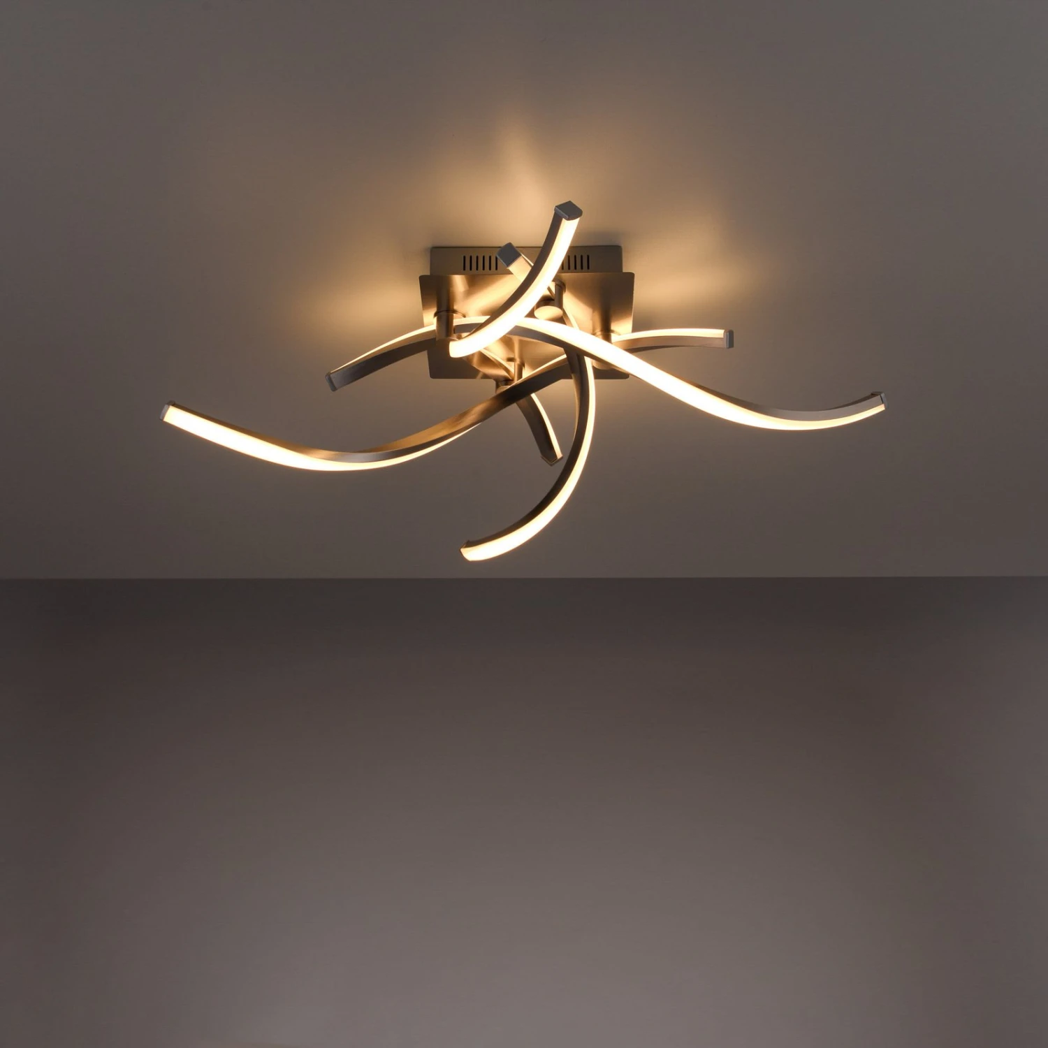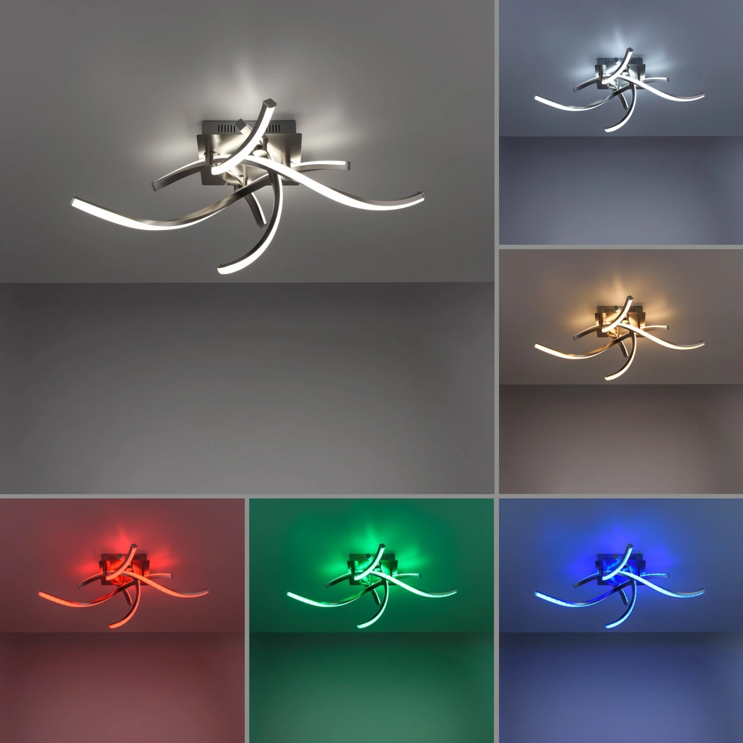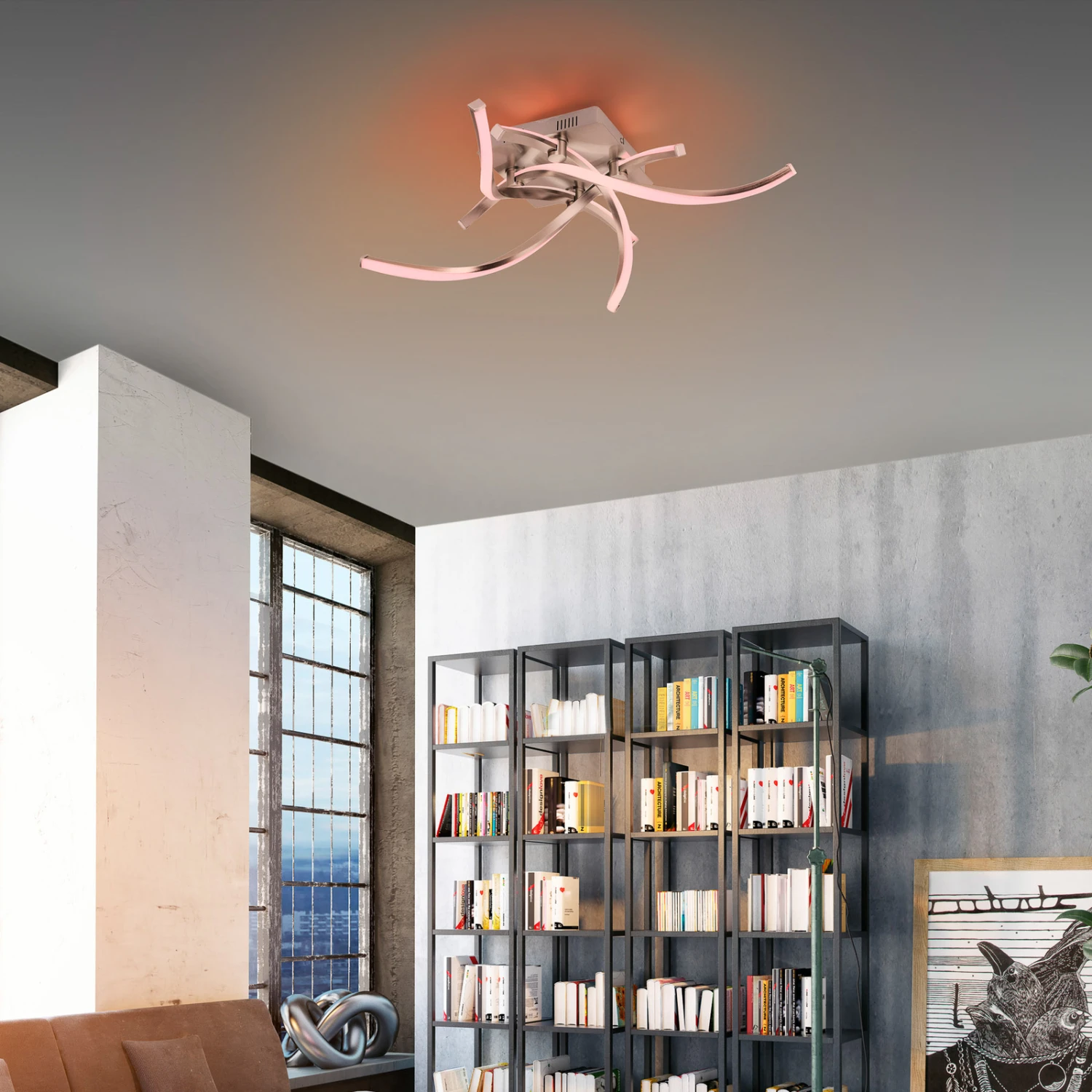 Ob Wohnzimmer, Schlafzimmer oder Flur, die moderne LED-Deckenleuchte Swing macht überall eine gute Figur. Dabei überzeugt sie nicht nur durch ihr auffälliges Design mit mehreren chaotisch geschwungenen Profilen, sondern auch durch ihre Funktionalität. Mit der mitgelieferten Fernbedienung lässt sich die Leuchte zum Beispiel vom Sofa oder Bett aus bequem bedienen. Ein- und Ausschalten, Dimmen oder das Schalten in verschiedene vorprogrammierte Lichtszenen sind hier möglich. Dabei erzeugen die integrierten LEDs nicht nur weißes, sondern auch farbiges Licht in vielfältigen Schattierungen.