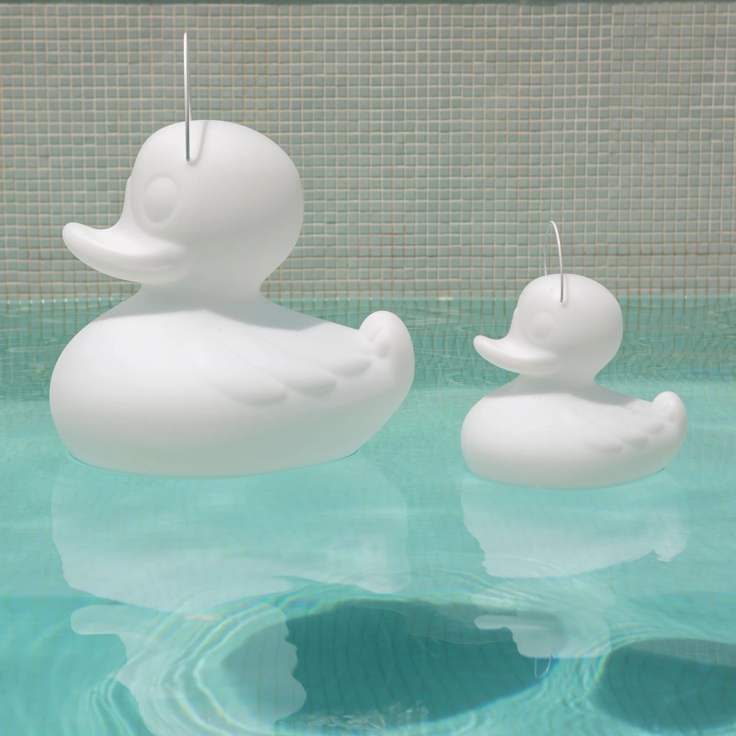 Ob private oder gewerbliche Außenbereiche, die moderne Dekorationsleuchte DUCK-DUCK S bringt kreatives Design in jeden Garten. Die Form begeistert Erwachsene wie Kinder gleichermaßen, erinnert die Leuchte doch an die klassische Badeente, die bei keinem Wannenbad fehlen darf. DUCK-DUCK S ist nun die Ente für den Außenpool: Sie ist schwimmfähig, stoß- und bruchfest sowie UV-resistent und kann somit bedenkenlos unter freiem Himmel eingesetzt werden.