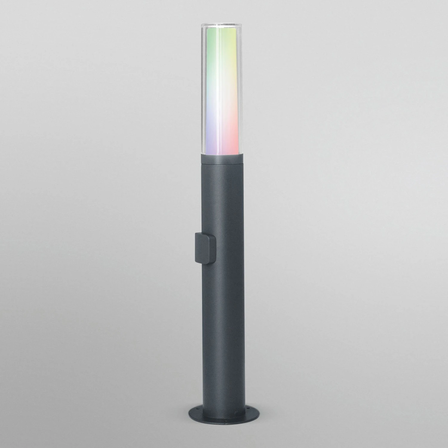 Mit ihrem dunkelgrauen Aluminiumkorpus und dem oben anschließenden Diffusor aus innen opalem und außen klarem Polycarbonat wirkt die Wegeleuchte Flare schlicht und modern. Das Highlight ist die Funktionalität: Die RGBW-LEDs erlauben die Auswahl von warmweißem Licht und zahllosen bunten Tönen. Dies erfolgt per App oder Sprachbefehl. Da die LEDVANCE SMART+ WiFi-Technologie eine Koppelung mit dem Smartphone/Tablet mittels WLAN ermöglicht, ist kein Gateway/Bridge erforderlich.