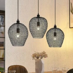 Benja hat drei Lampenschirme, die nicht etwa klassisch geformt sind, sondern aus feinmaschigem Metall bestehen und dabei recht lichtdurchlässig sind. So kann man auch das Leuchtmittel immer noch gut erkennen und sollte dieses so wählen, dass es dekorativ aussieht und zur Gesamtoptik passt. Die Lichteffekte sind gemütlich und individuell, im Raum bildet sich ein schönes Spiel aus feinen Schatten und Lichtsequenzen ab, das die Wohnlichkeit schön unterstreicht. Mit der länglichen, dreiflammigen Form eignet sich die Pendelleuchte besonders gut zur Tischbeleuchtung im Essbereich.