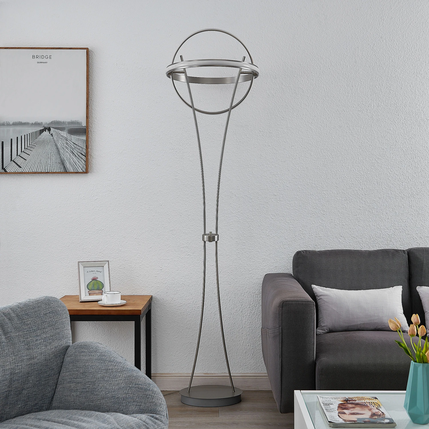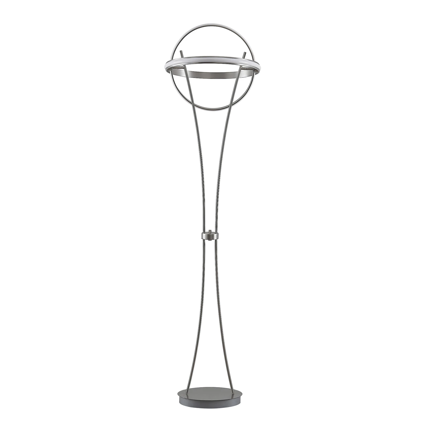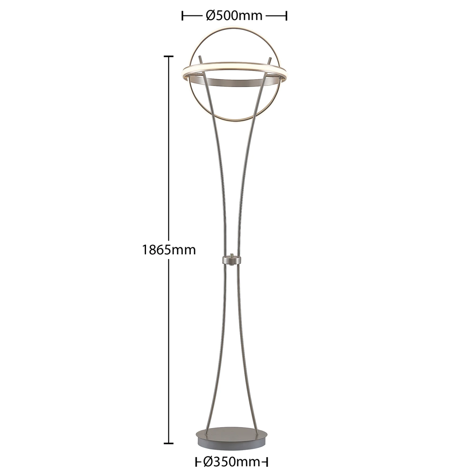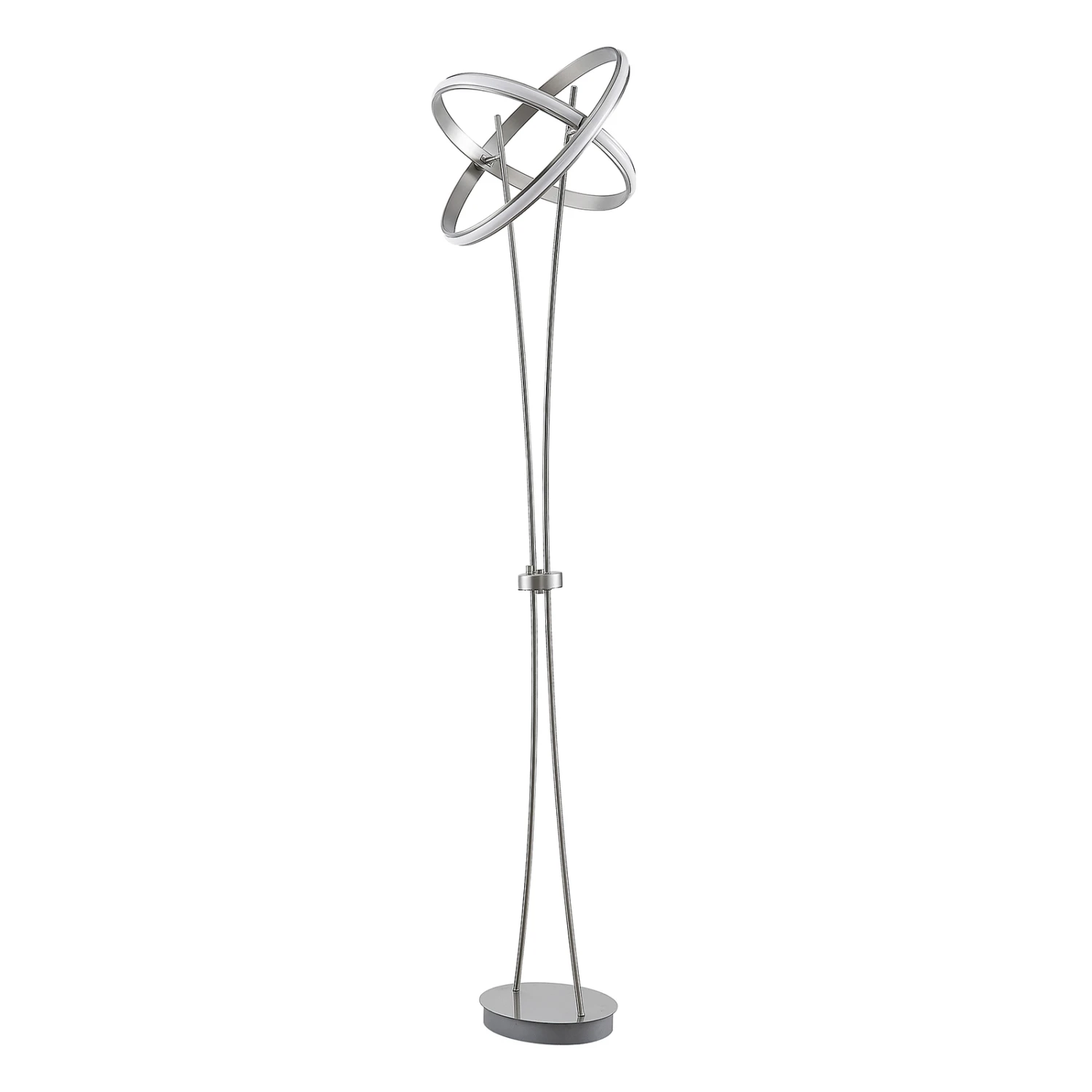 Die LED-Stehlampe Berkay fällt vor allem durch ihren außergewöhnlichen Leuchtenschirm auf. Sie ist aus Stahl und Aluminium gefertigt und in dezenten Nickelfarben gehalten. Ihr Leuchtenkörper besteht aus einem horizontal angebrachten und einem vertikal angebrachten Kreis, an denen die festverbauten LEDs verlaufen. Diese runden Streben sitzen wiederum auf zwei schlanken Balken, welche sich schwungvoll vom Standfuß erheben und der Leuchte ein elegantes Aussehen verleihen. Über einen Schalter am Kabel ist die LED-Stehleuchte Berkay stufenlos dimmbar und die Memory-Funktion sorgt für eine bequeme Speicherung dieser Einstellung. Mit dem schlanken und modernen Design passt sie gut in verschiedenste Einrichtungsstile und macht selbst aus kleinsten Räumen etwas ganz Besonderes.