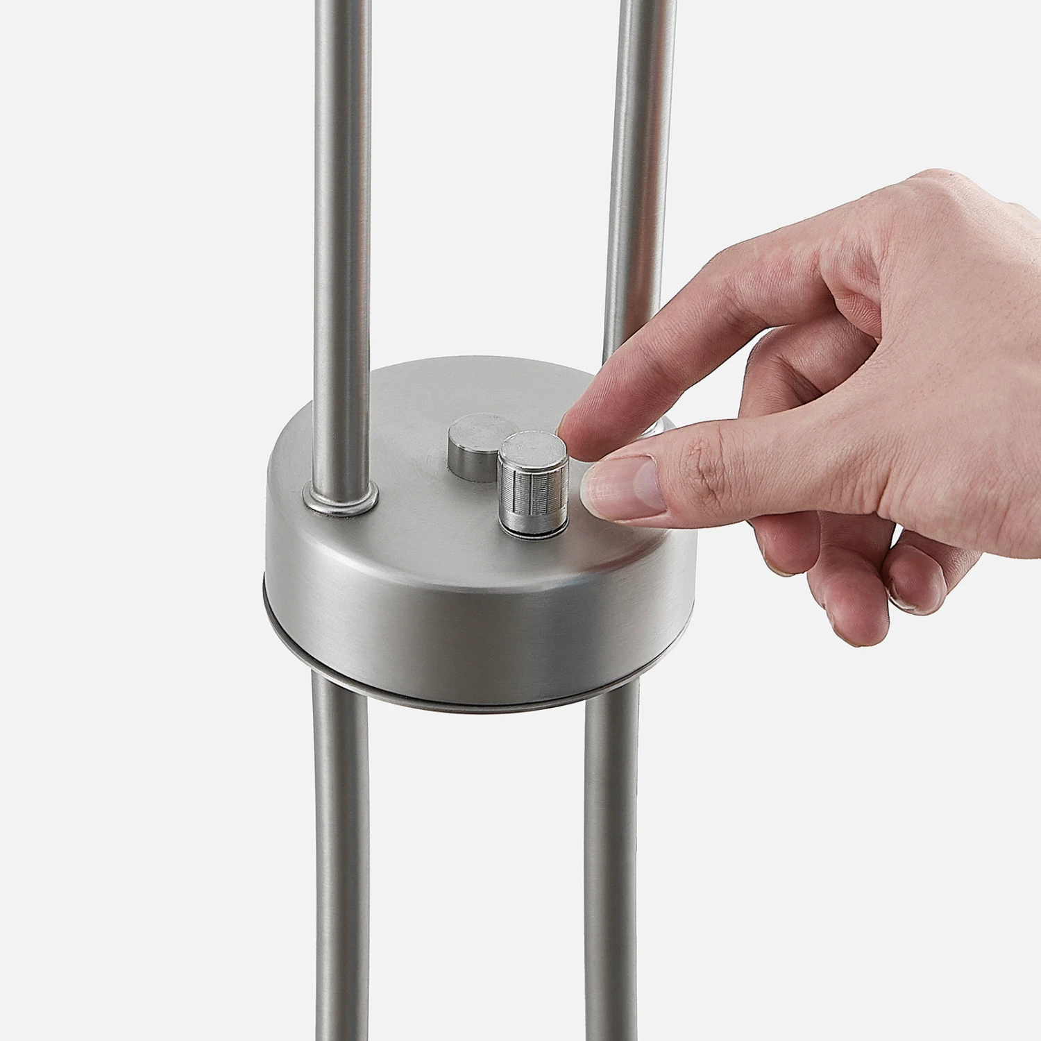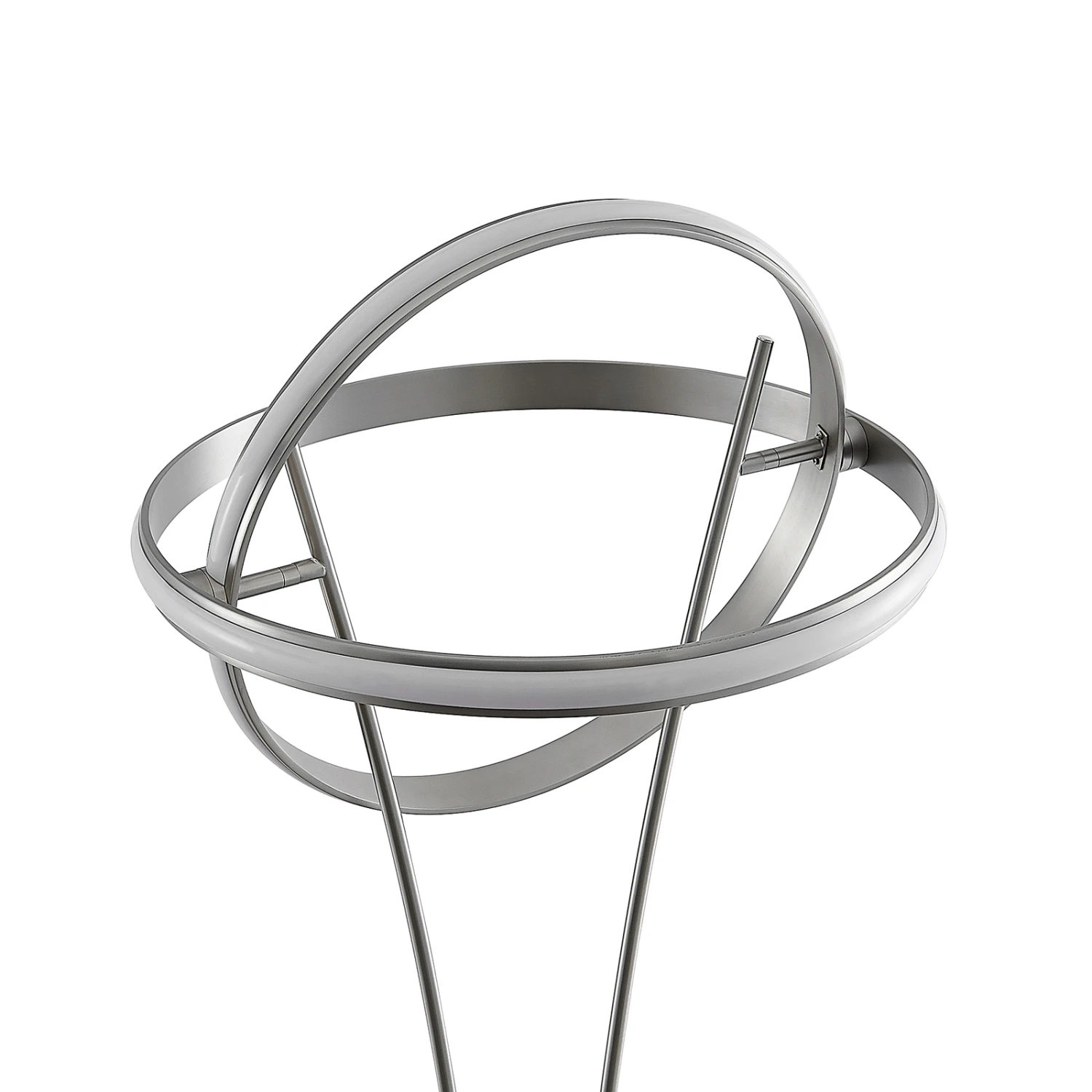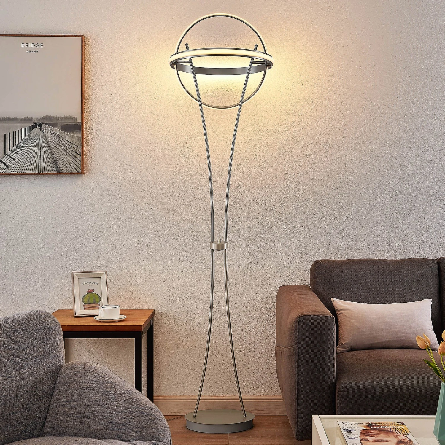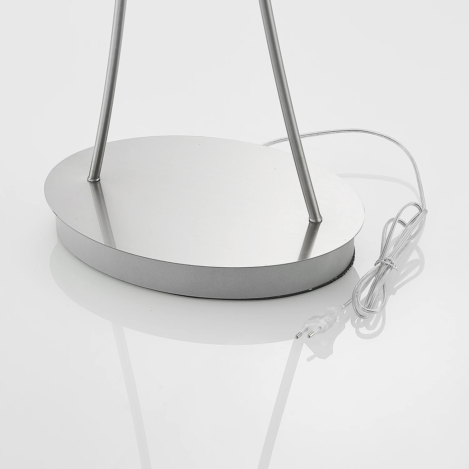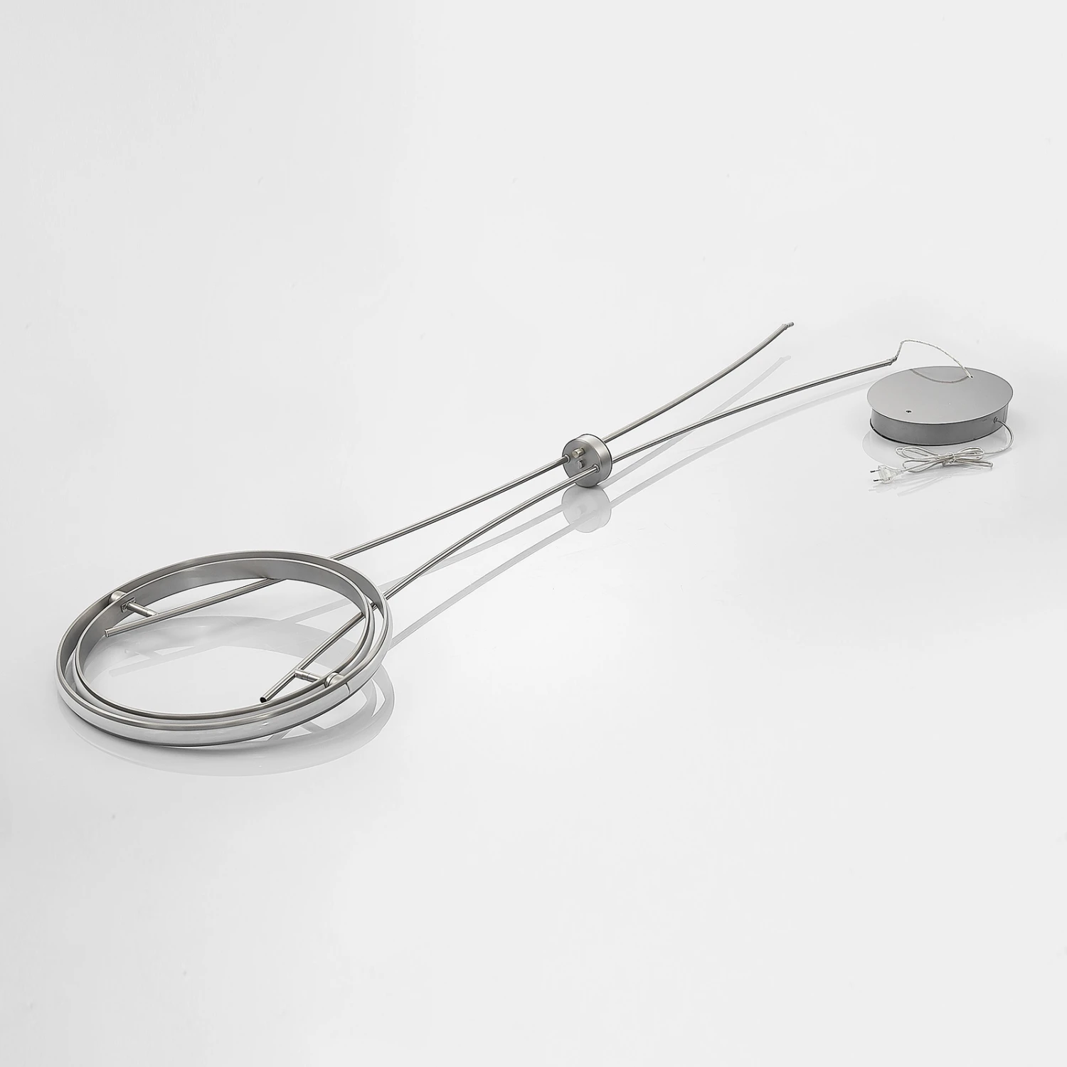 Die LED-Stehlampe Berkay fällt vor allem durch ihren außergewöhnlichen Leuchtenschirm auf. Sie ist aus Stahl und Aluminium gefertigt und in dezenten Nickelfarben gehalten. Ihr Leuchtenkörper besteht aus einem horizontal angebrachten und einem vertikal angebrachten Kreis, an denen die festverbauten LEDs verlaufen. Diese runden Streben sitzen wiederum auf zwei schlanken Balken, welche sich schwungvoll vom Standfuß erheben und der Leuchte ein elegantes Aussehen verleihen. Über einen Schalter am Kabel ist die LED-Stehleuchte Berkay stufenlos dimmbar und die Memory-Funktion sorgt für eine bequeme Speicherung dieser Einstellung. Mit dem schlanken und modernen Design passt sie gut in verschiedenste Einrichtungsstile und macht selbst aus kleinsten Räumen etwas ganz Besonderes.