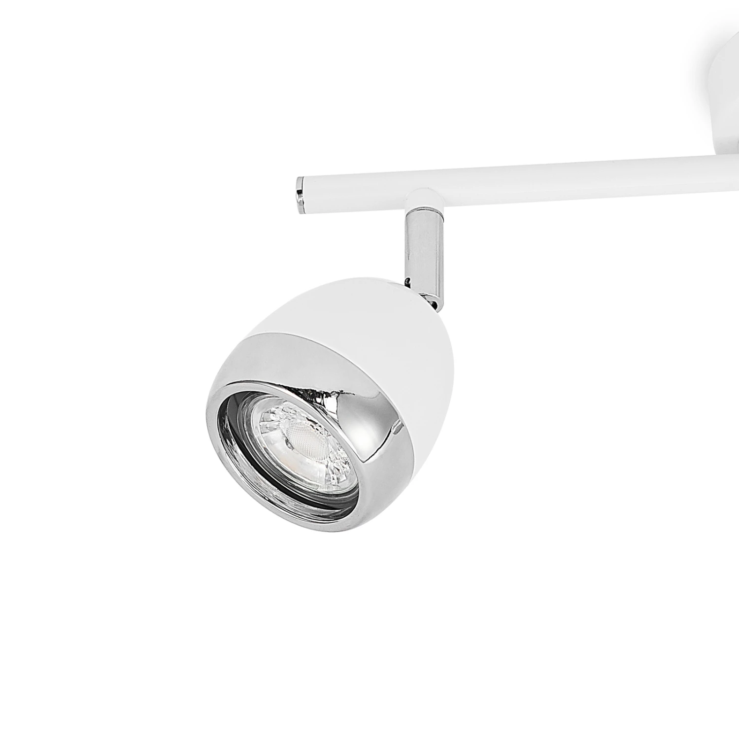 Der Deckenstrahler Khaled kommt in einem schlanken, weitläufigen Design und überzeugt mit seinem eleganten Aussehen. An einer runden Deckenhalterung ist eine längliche Strebe horizontal angebracht und trägt zwei Leuchtenschirme an ihren Enden. Der komplette Leuchtenkörper besteht aus Stahl und ist in weiß gehalten, währenddessen am oberen Rand der Lampenschirme jeweils ein chromfarbener Ring angebracht ist, der der Optik das gewisse Etwas verleiht. In die Leuchte können GU10 Leuchtmittel eingesetzt werden und sorgen für die entsprechende Ausleuchtung. Das weitläufige Äußere des Deckenspots Khaled und sein elgantes Design lassen sich mühelos in moderne Einrichtungsstile integrieren und finden vor allem in länglich geschnittenen Räumen einen perfekten Platz.