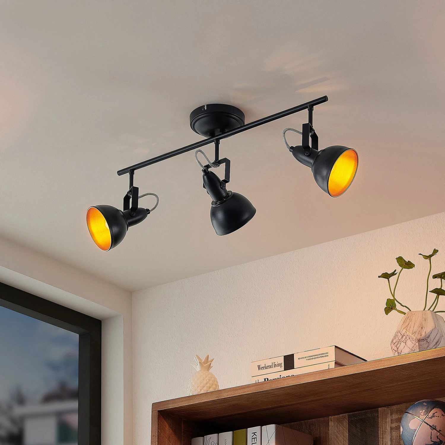 Der Deckenstrahler Morgana verfügt über drei bewegliche Strahler, die alle individuell gedreht und geschwenkt werden können. So kann das Lichtbild möglichst zielgerichtet bestimmt werden. Zudem sind die einzelnen Schirme alle außen schwarz, während die Innenseite jedoch golden getönt ist. Dadurch entsteht nicht nur ein Kontrast in der Optik, sondern auch eine warme Lichtabstrahlung, die besonders wohnlich daherkommt. In der dreiflammigen Ausführung ist Morgana als Strahler besonders schön für Wohnbereiche und Küchen geeignet, wobei die Ergänzung um weitere Lichtquellen durchaus denkbar ist.