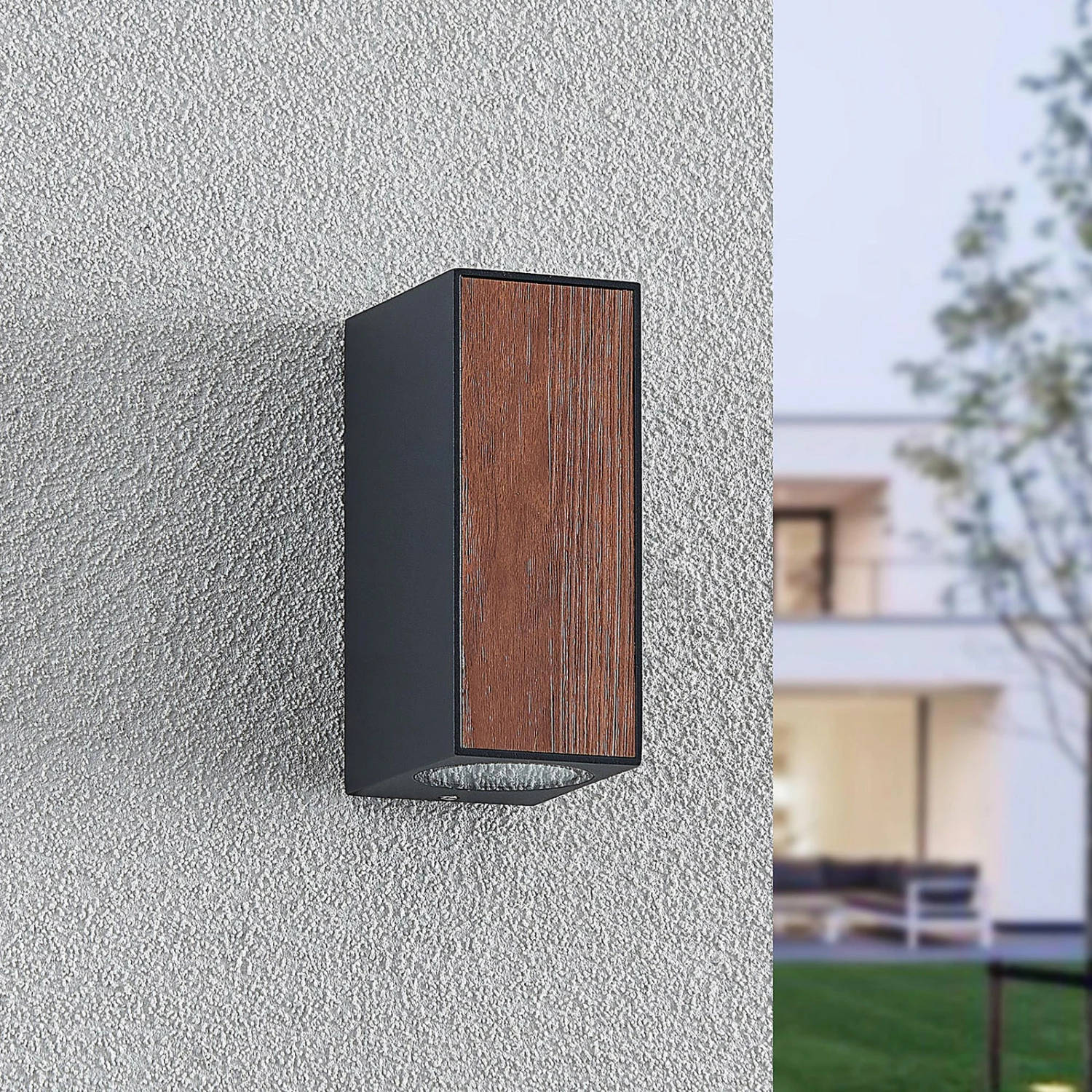 LED-Außenwandleuchte Cimala in länglicher Form mit Holzdekor, up & down
