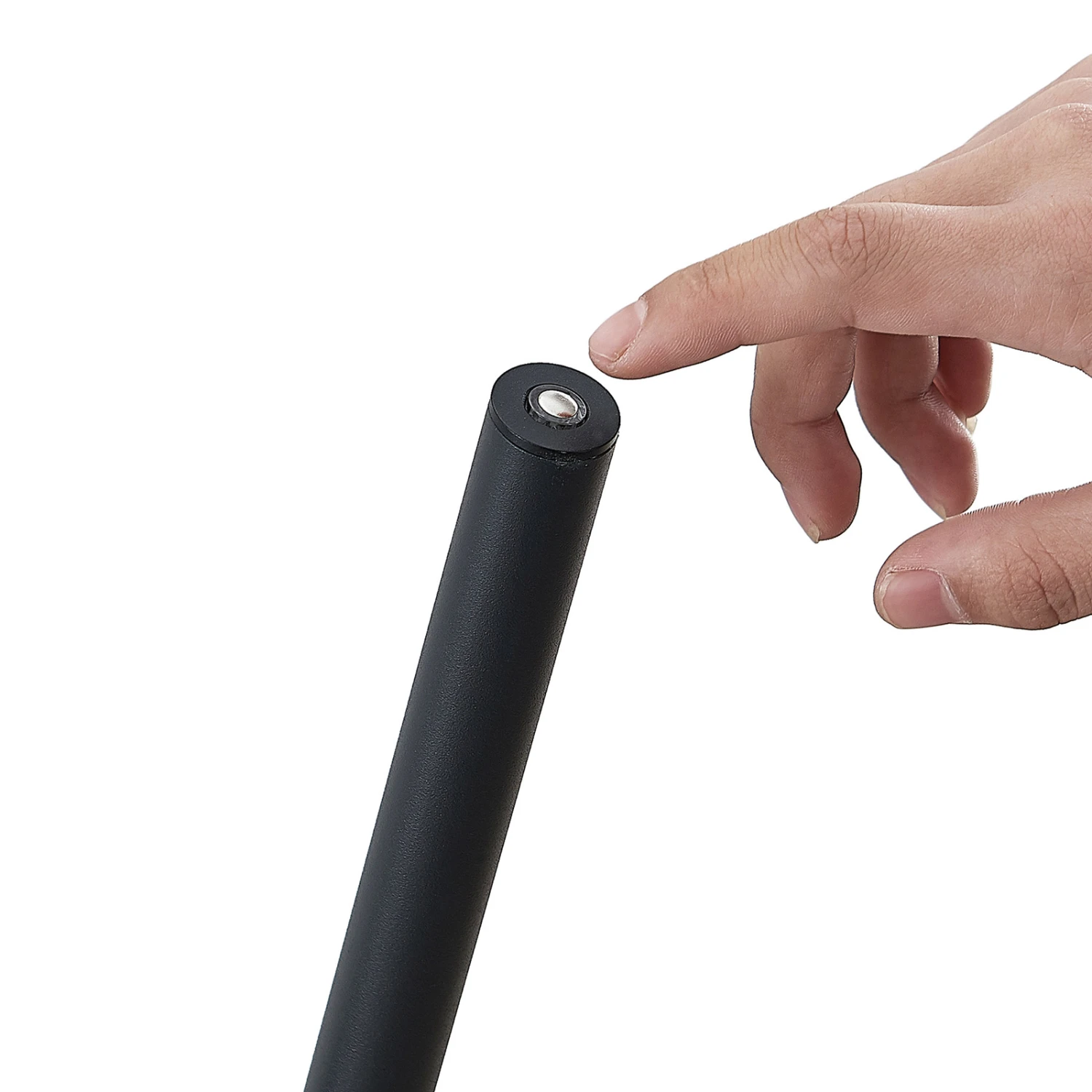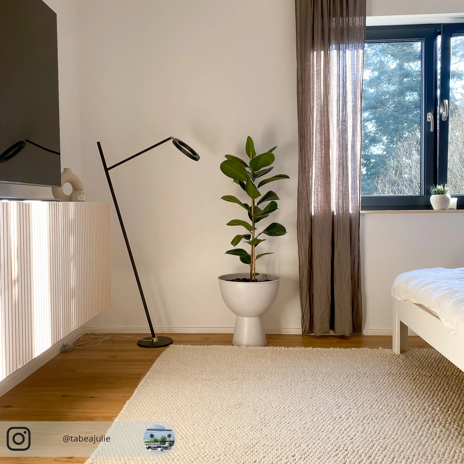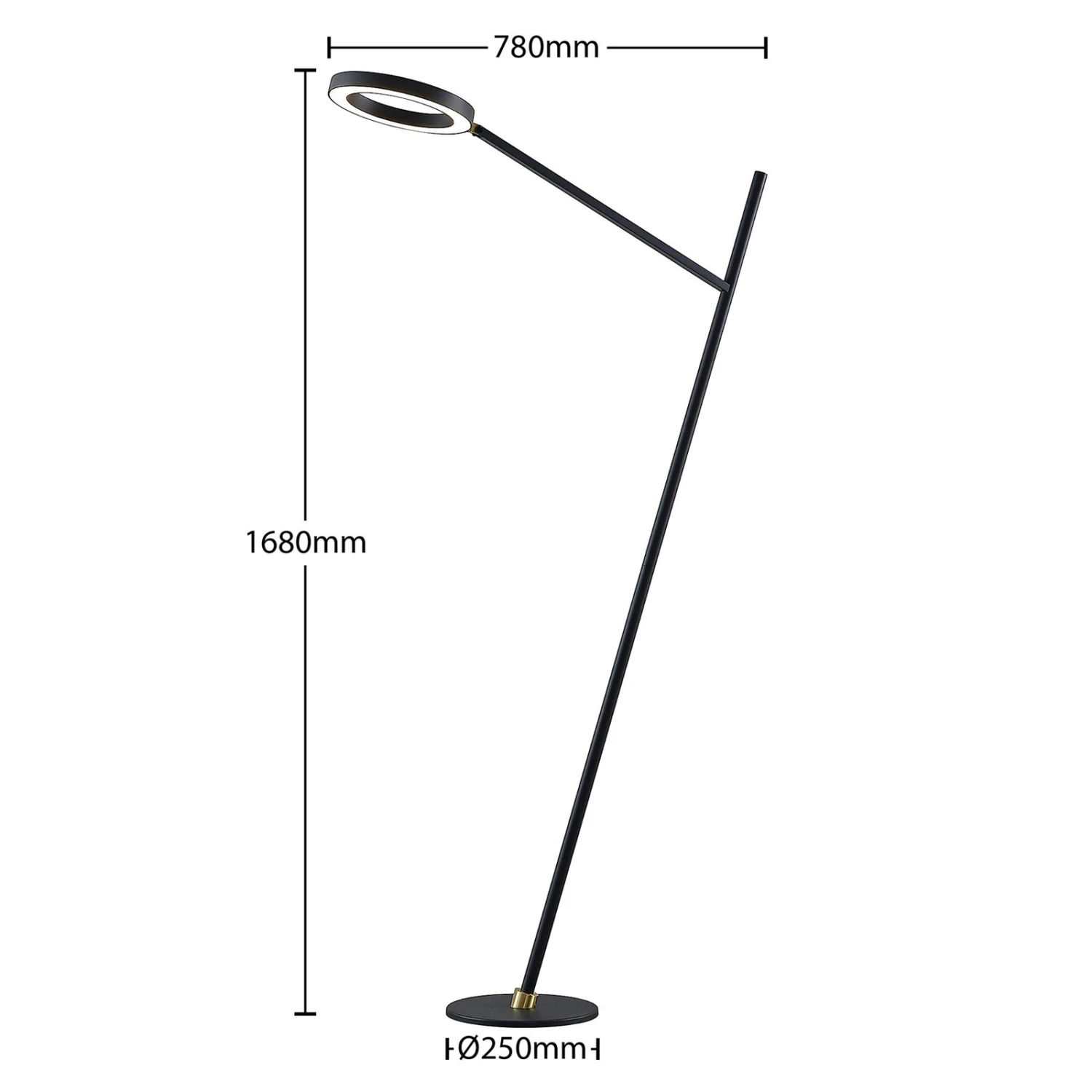 Die Gestaltung dieser LED-Stehlampe ist höchst modern und vor allem minimalistisch. Das bedeutet, dass sie sich mit allen zeitgemäßen und detailreduzierten Wohnstilen richtig gut kombinieren lässt. Der flache Lampenfuß ist rund und schwarz, während zwei schräg zueinander angeordnete Stäbe das Gestell bilden und das Konstrukt oben schließlich in einem ringförmigen Schirm endet, der geschwenkt werden kann. Dieser ist mit effizienten LEDs bestückt und leuchtet hell. Bei Bedarf kann aber ein integrierter Touchdimmer für die Regulation der Helligkeit genutzt werden. Die Metalloberfläche ist fast durchgängig schwarz, lediglich das Gelenk am Schirm und einer kleiner Ring am Fuß sind goldfarben getönt und sorgen für einen dezenten, aber sehenswerten Kontrast.