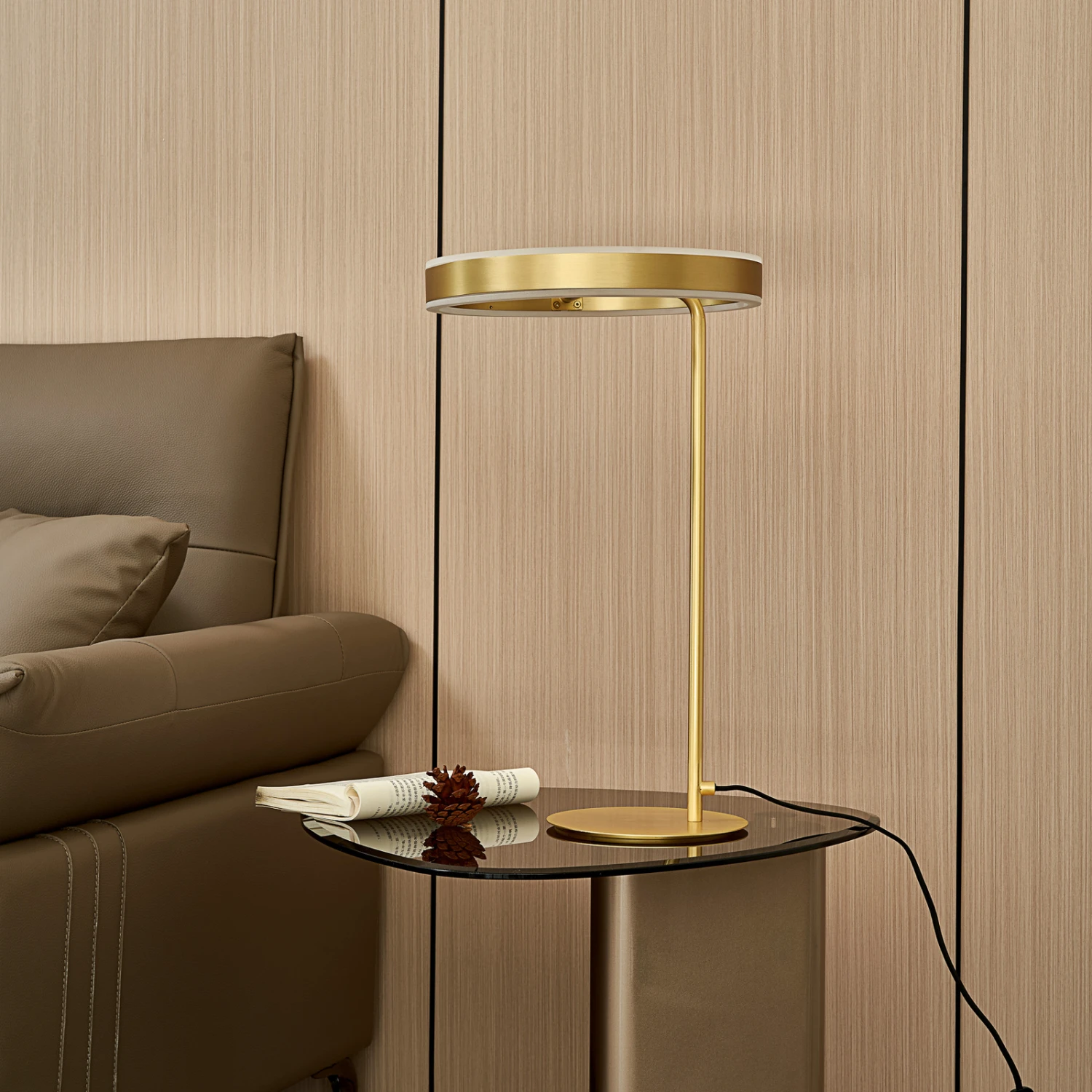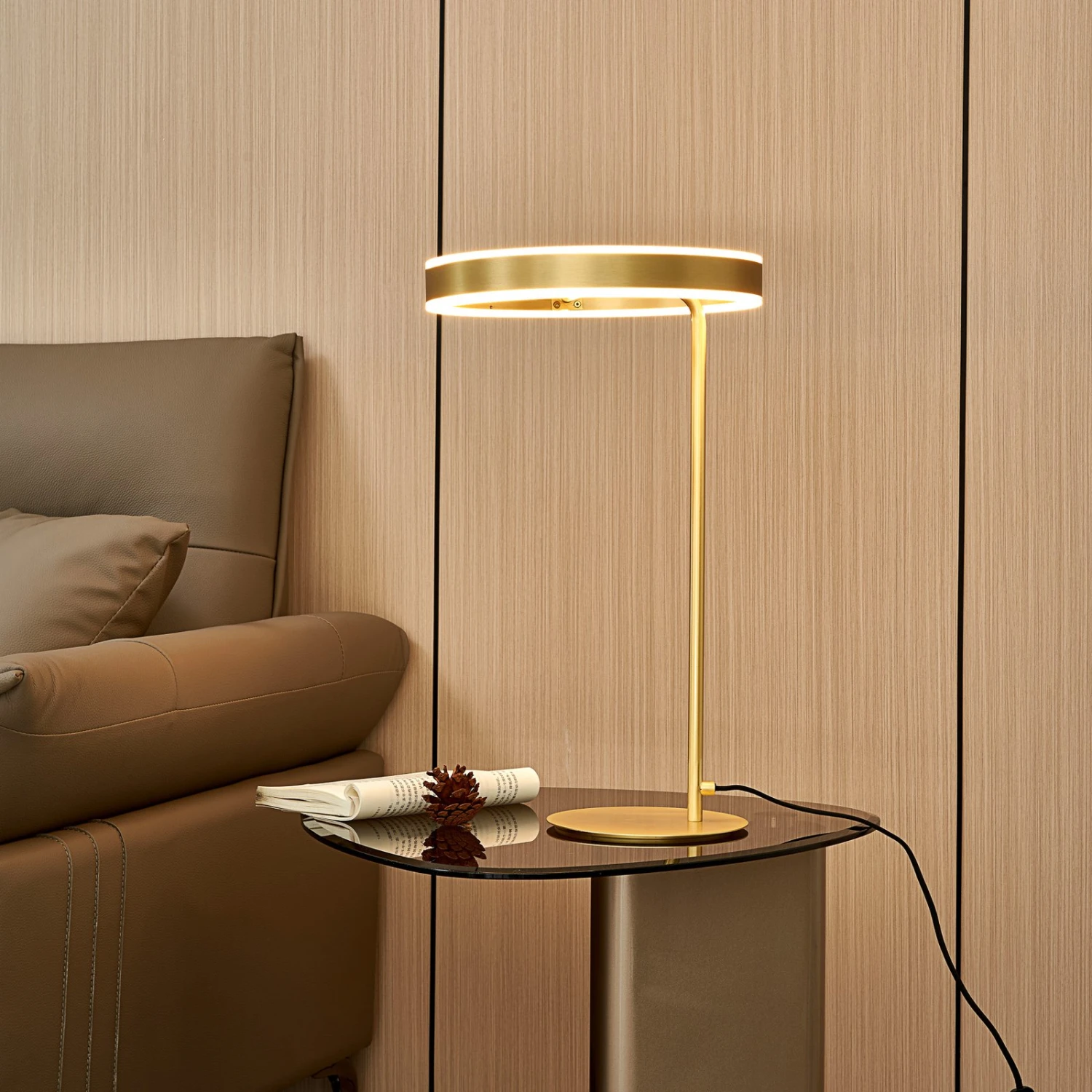 Messingfarbene Design-Tischleuchte Yekta mit Schirm in Ringform, dimmbar via Schalter in drei Stufen