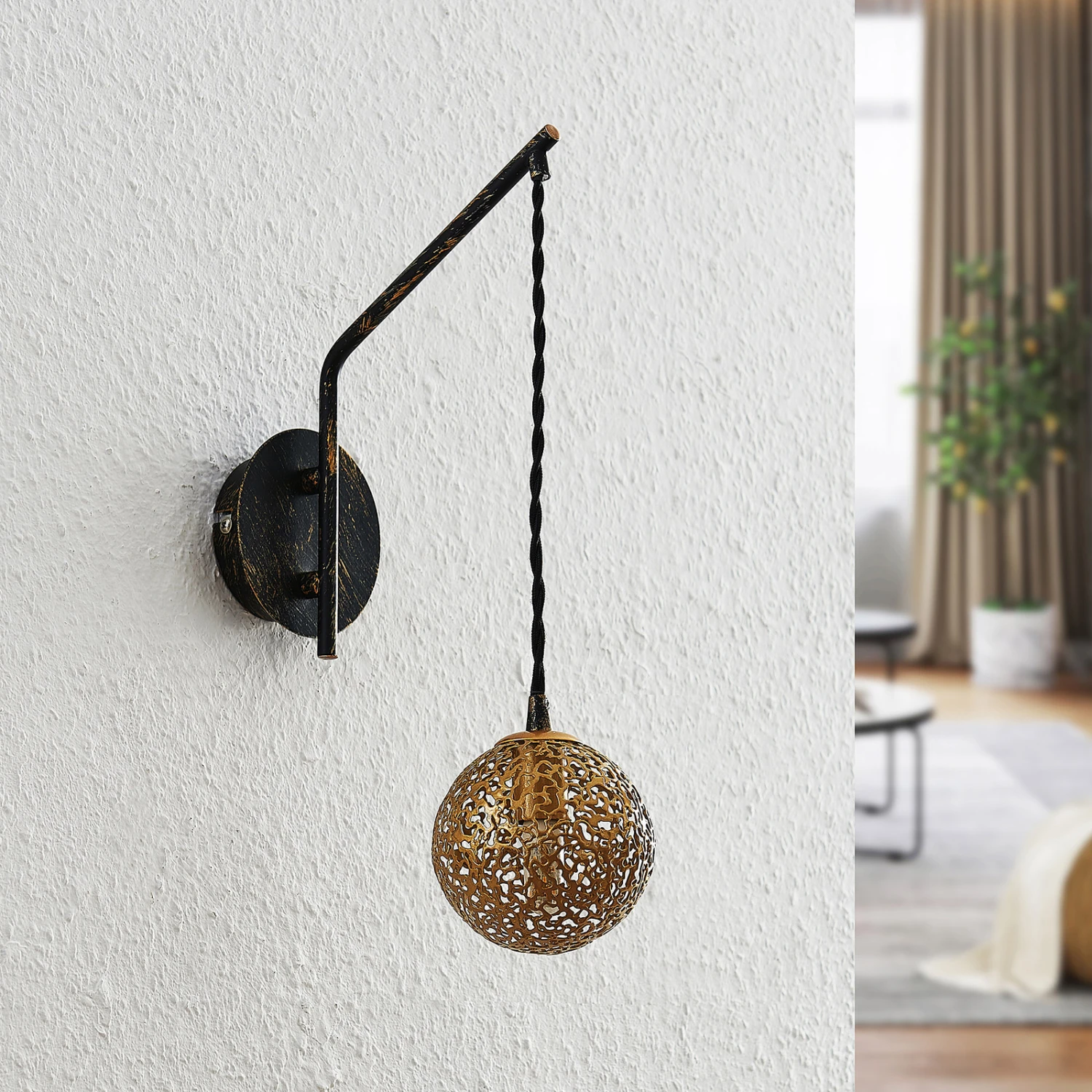 Die Wandleuchte Zale besteht aus einer runden Halterung, an welcher ein langer Leuchtenarm befestigt ist. An dem Leuchtenarm befindet sich eine goldene Kugel, die Platz für ein Leuchtmittel hat. Das Leuchtmittel ist nicht im Lieferumfang enthalten und kann frei gewählt werden. Da der Lampenschirm über feine Aussparungen verfügt, dringt das Licht nur gedämpft in den Raum und bekommt dabei einen goldenen Schimmer verliehen. Das Muster im orientalischen Stil kreiert zusätzlich faszinierende Lichteffekte mit einem ausgewogenen Anteil von Licht und Schatten.