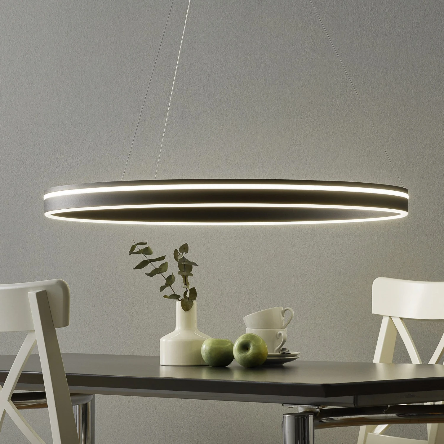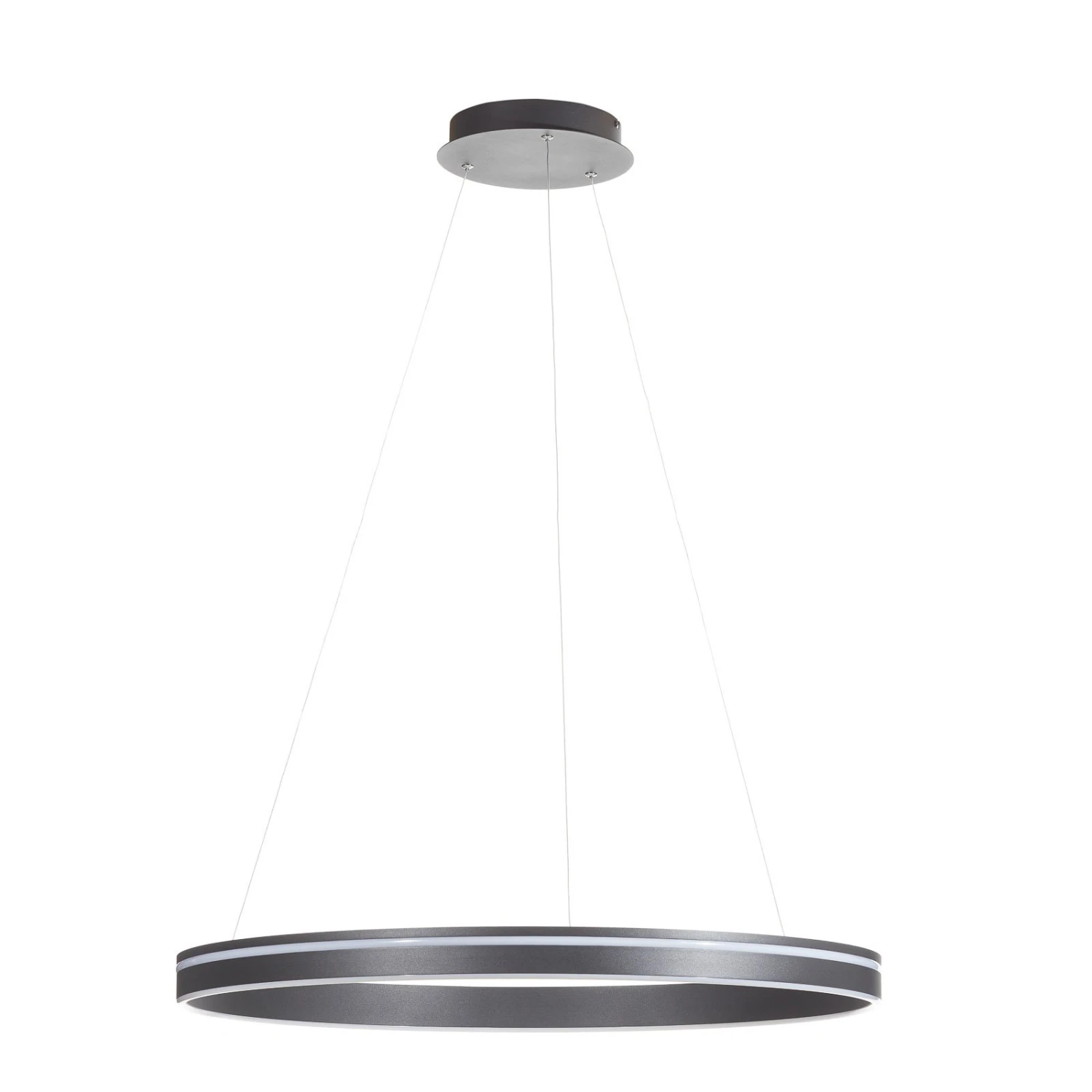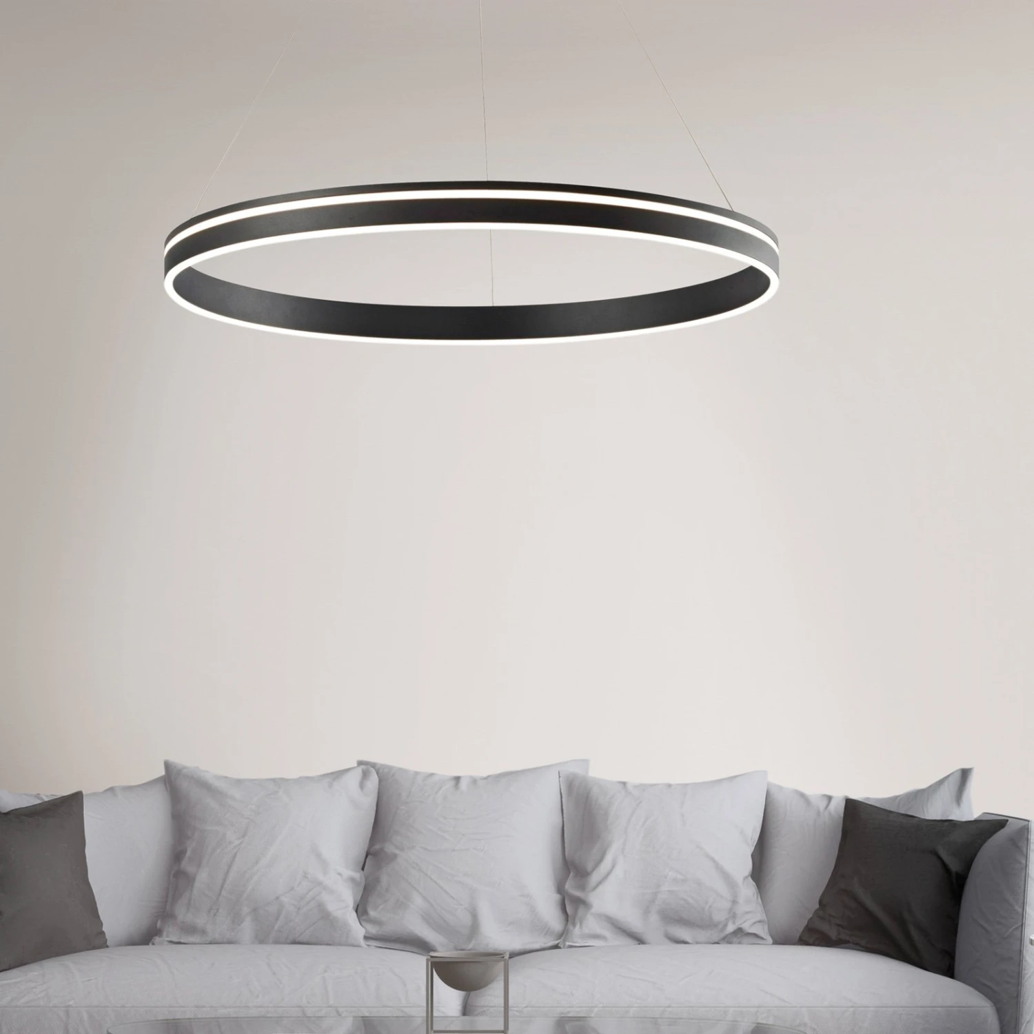 Q-Vito ist eine durch und durch moderne LED-Pendelleuchte. Sie ist als waagrecht hängender Ring aus Metall geformt, der mit zwei umlaufenden leuchtenden Streifen an der Außen- und Unterseite besetzt ist.