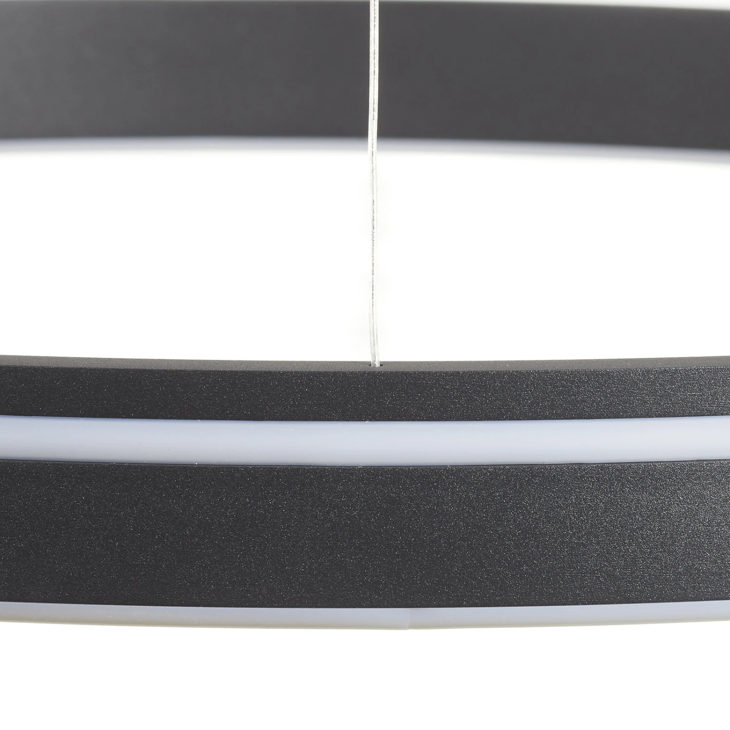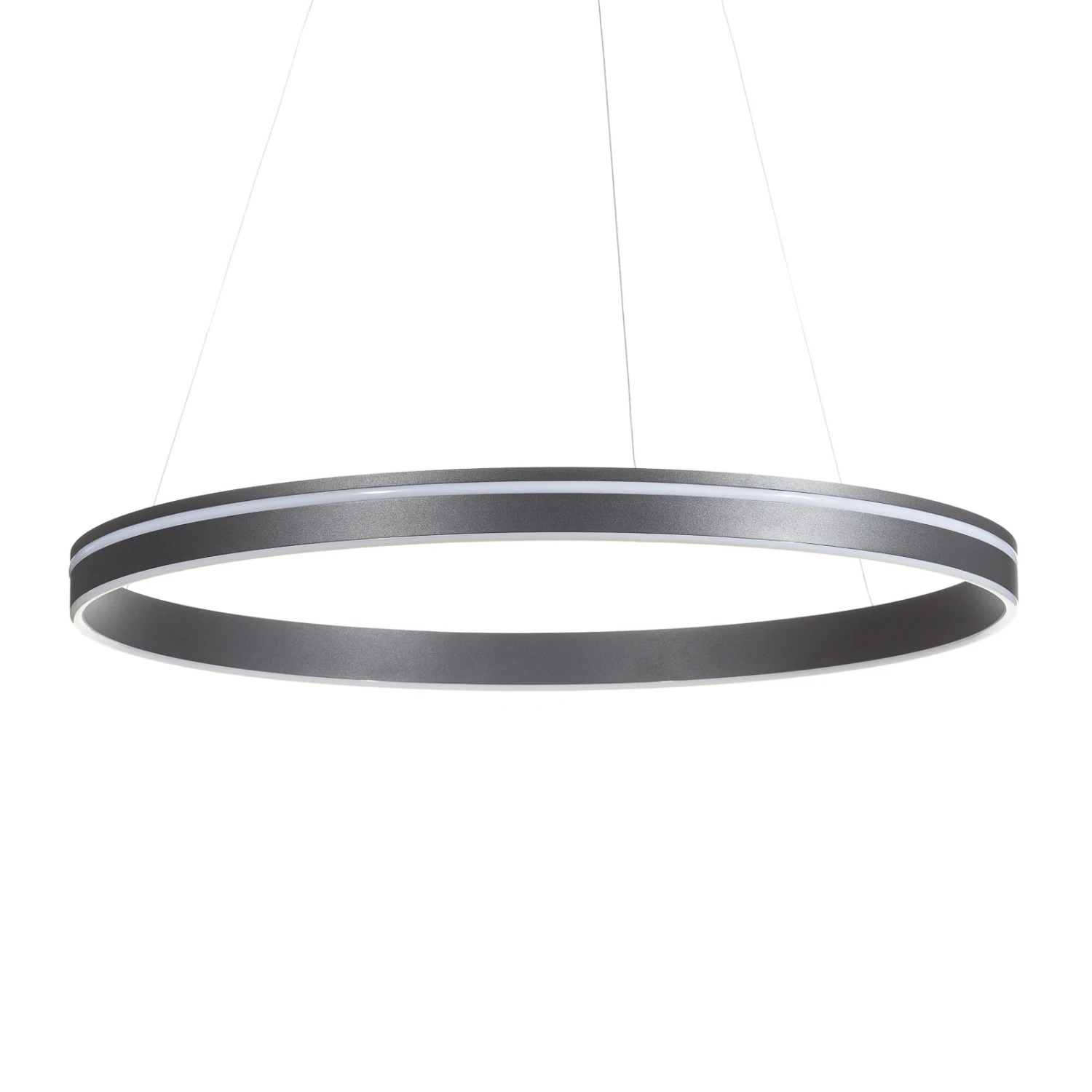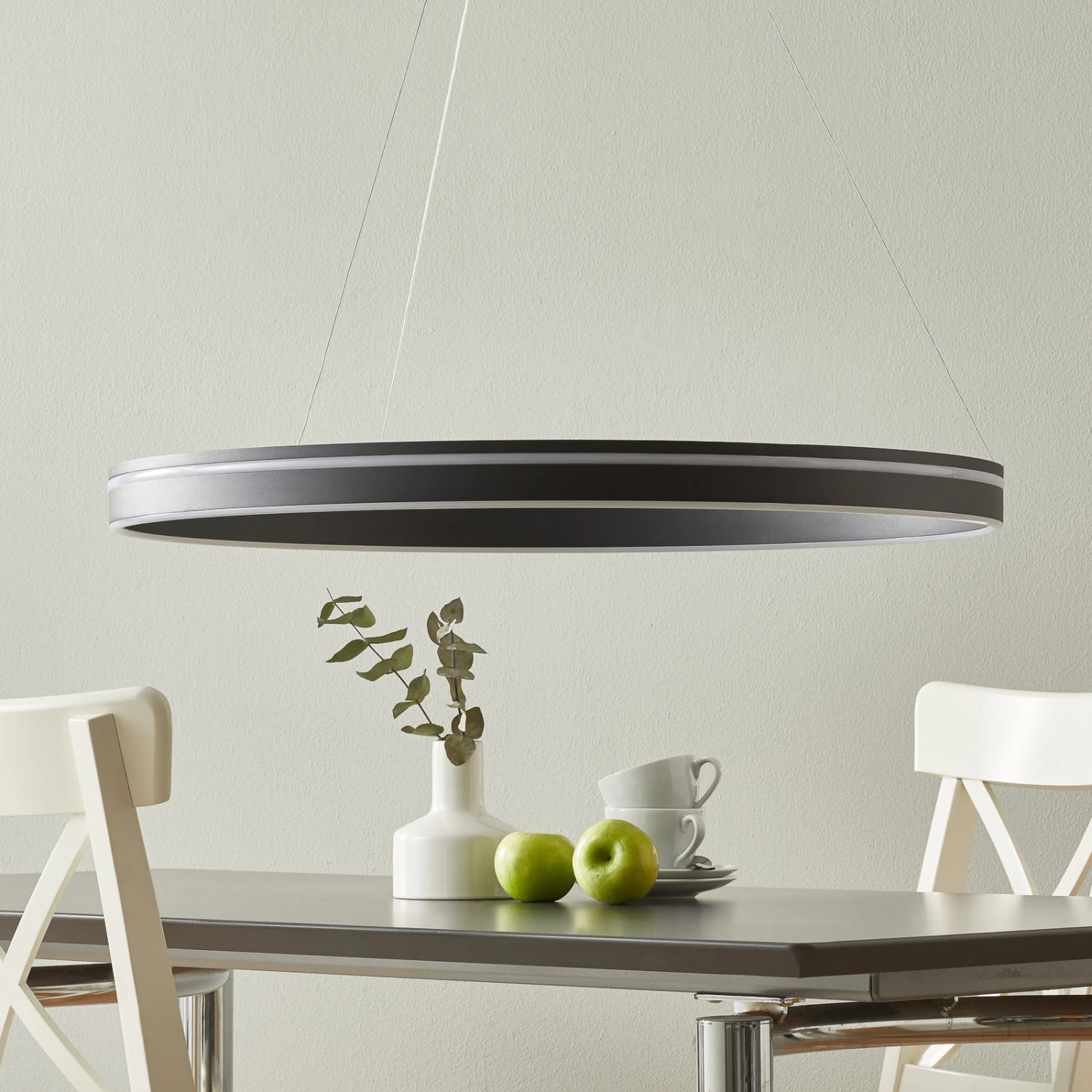 Q-Vito ist eine durch und durch moderne LED-Pendelleuchte. Sie ist als waagrecht hängender Ring aus Metall geformt, der mit zwei umlaufenden leuchtenden Streifen an der Außen- und Unterseite besetzt ist.