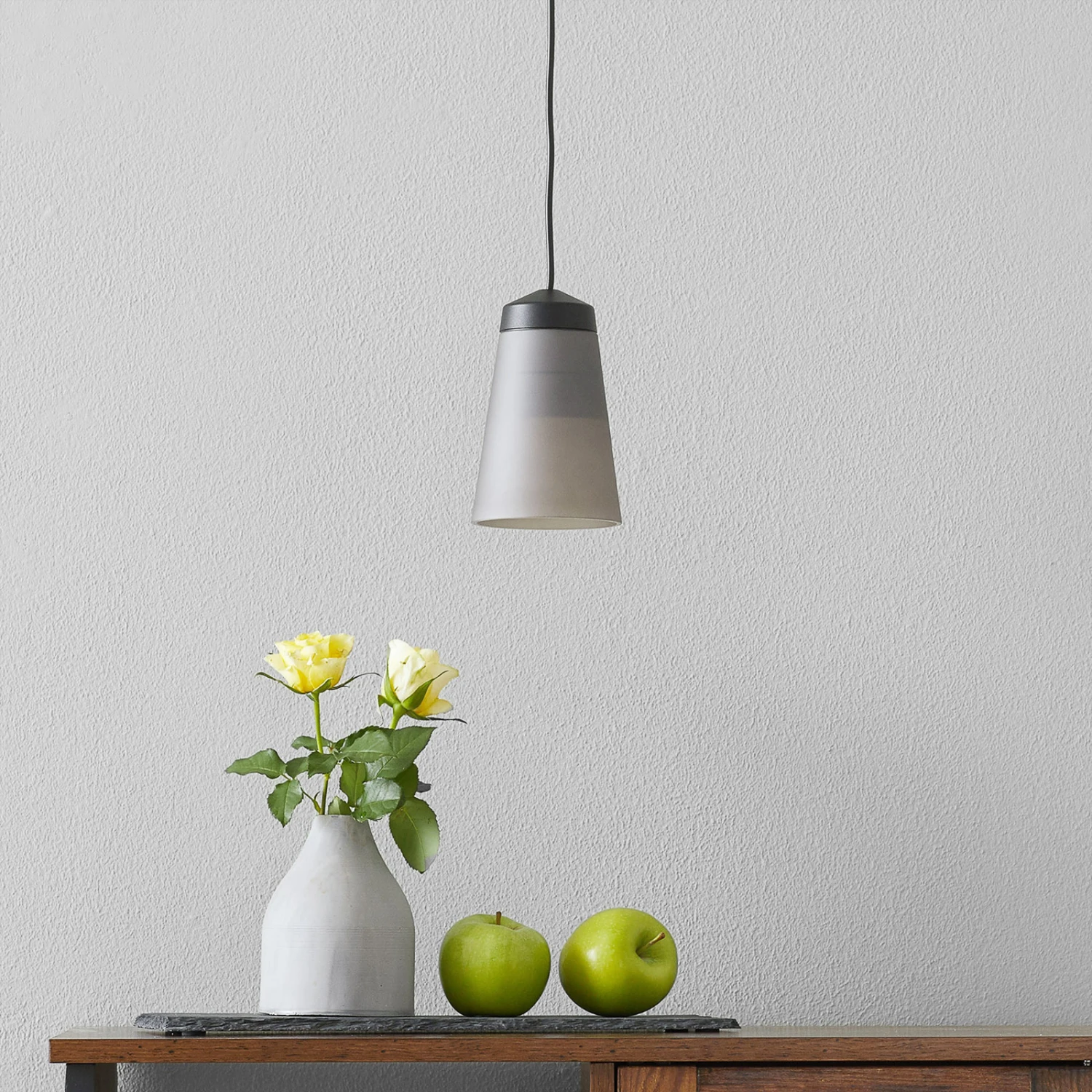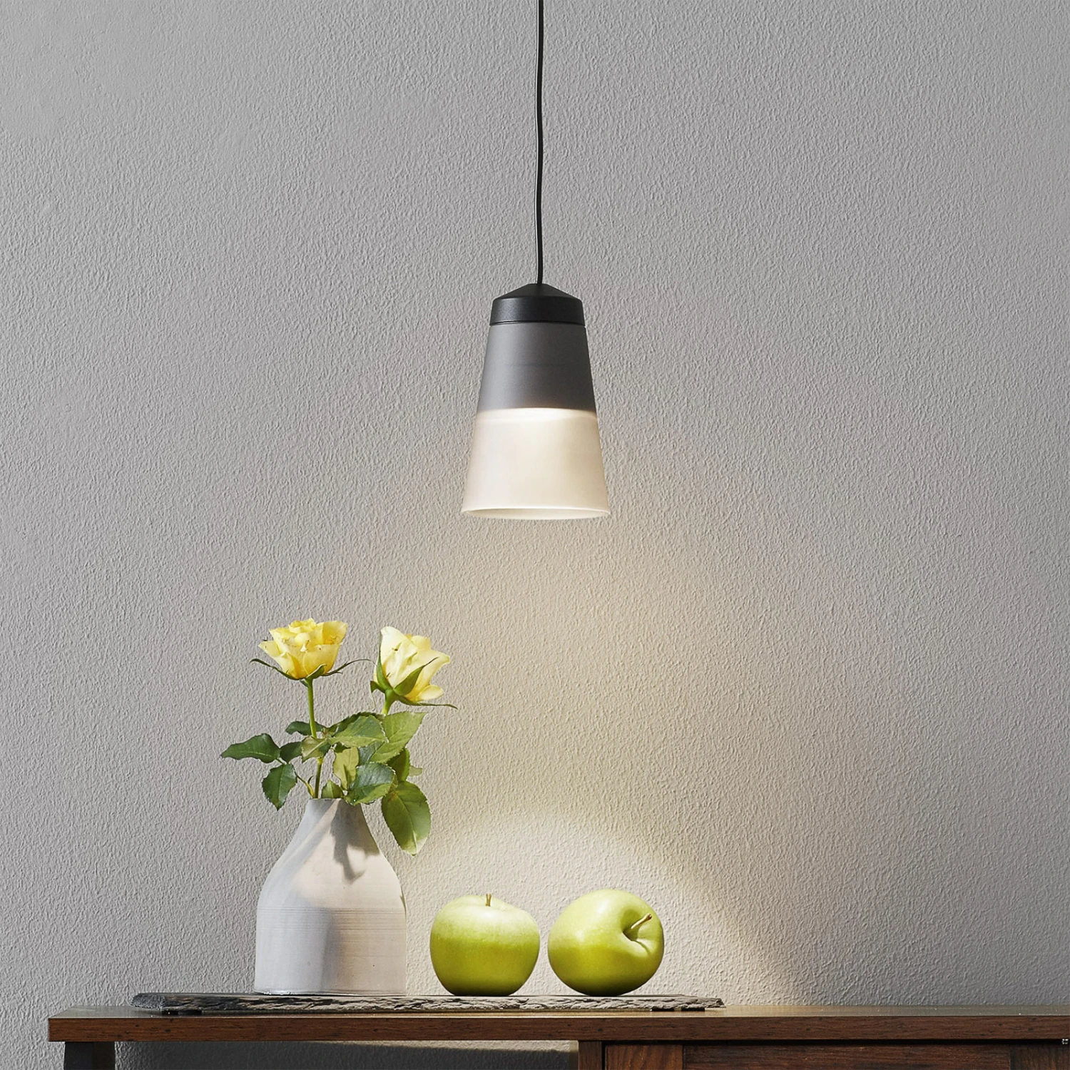 Die einflammige Hängeleuchte Leo 2 ist mit einem entsprechenden Adapter zum Betrieb in 3-Phasen-Stromschienen ausgestattet. Kabel und Schirm sind durchweg in Schwarz gehalten. Der Schirm ist als Kegelstumpf geformt; der obere Bereich ist aus Aluminium gearbeitet, unten schließt ein Abschnitt aus dunkel getöntem Glas an. Je nach Ausstrahlwinkel der zu wählenden GU10-Lampe lässt sich eine direkte Spot-Beleuchtung erzielen oder das Rauchglas betonen.