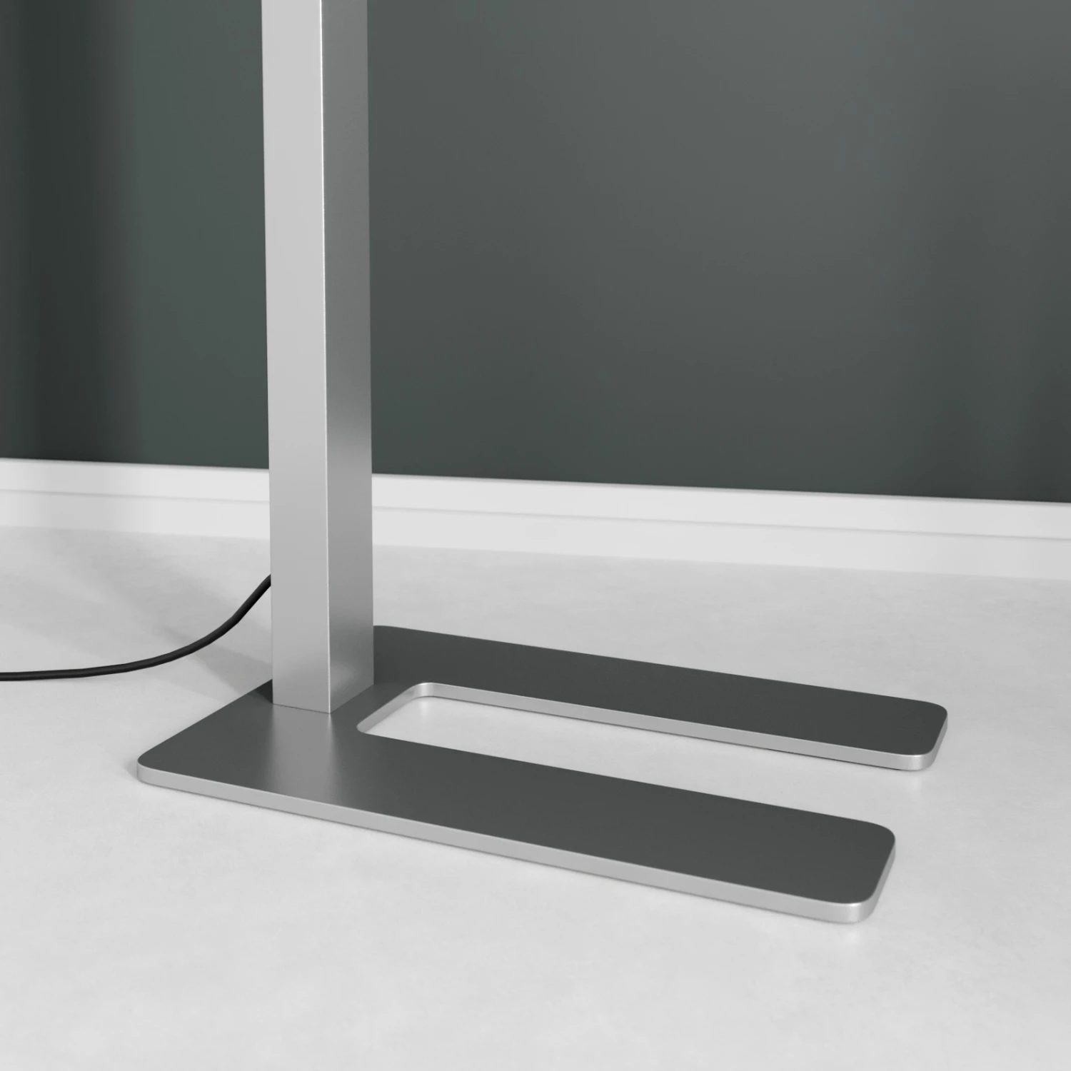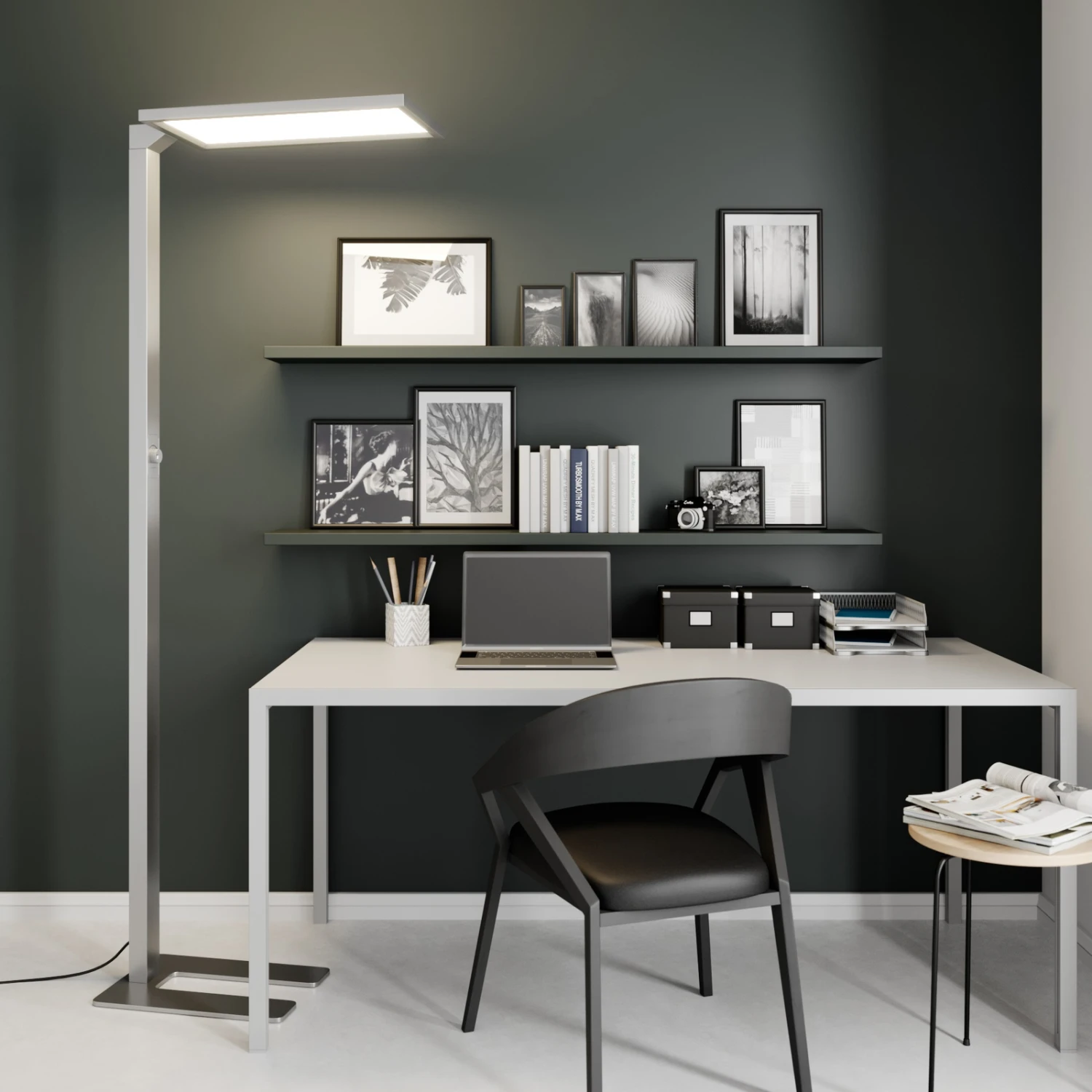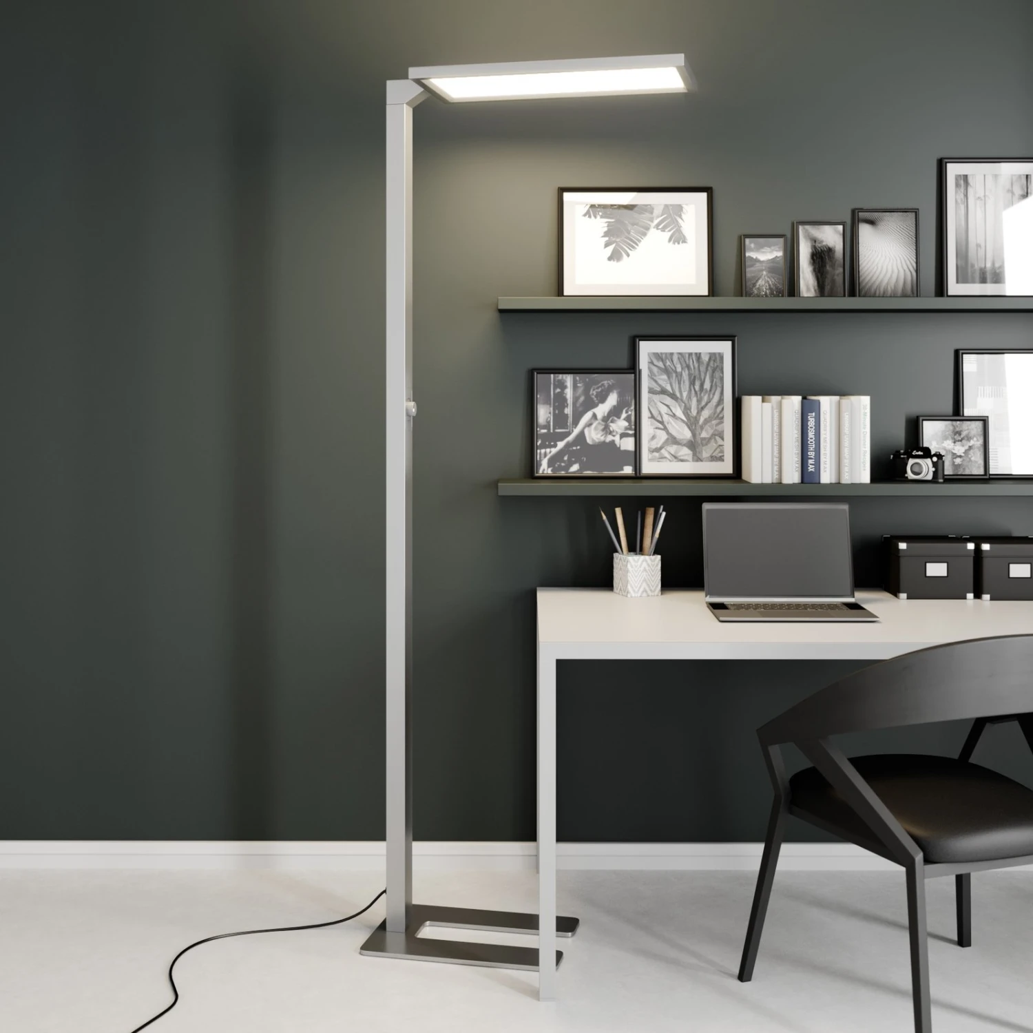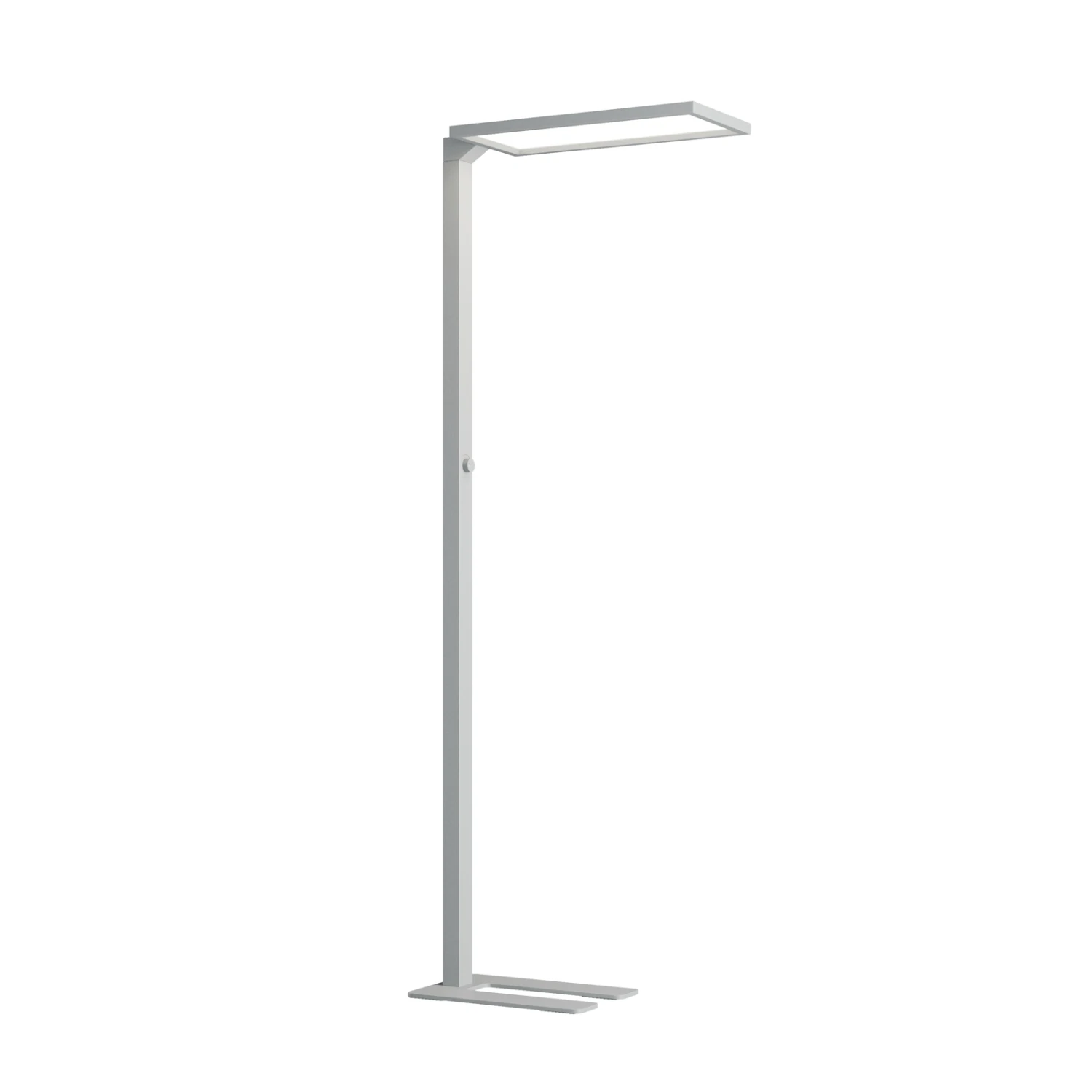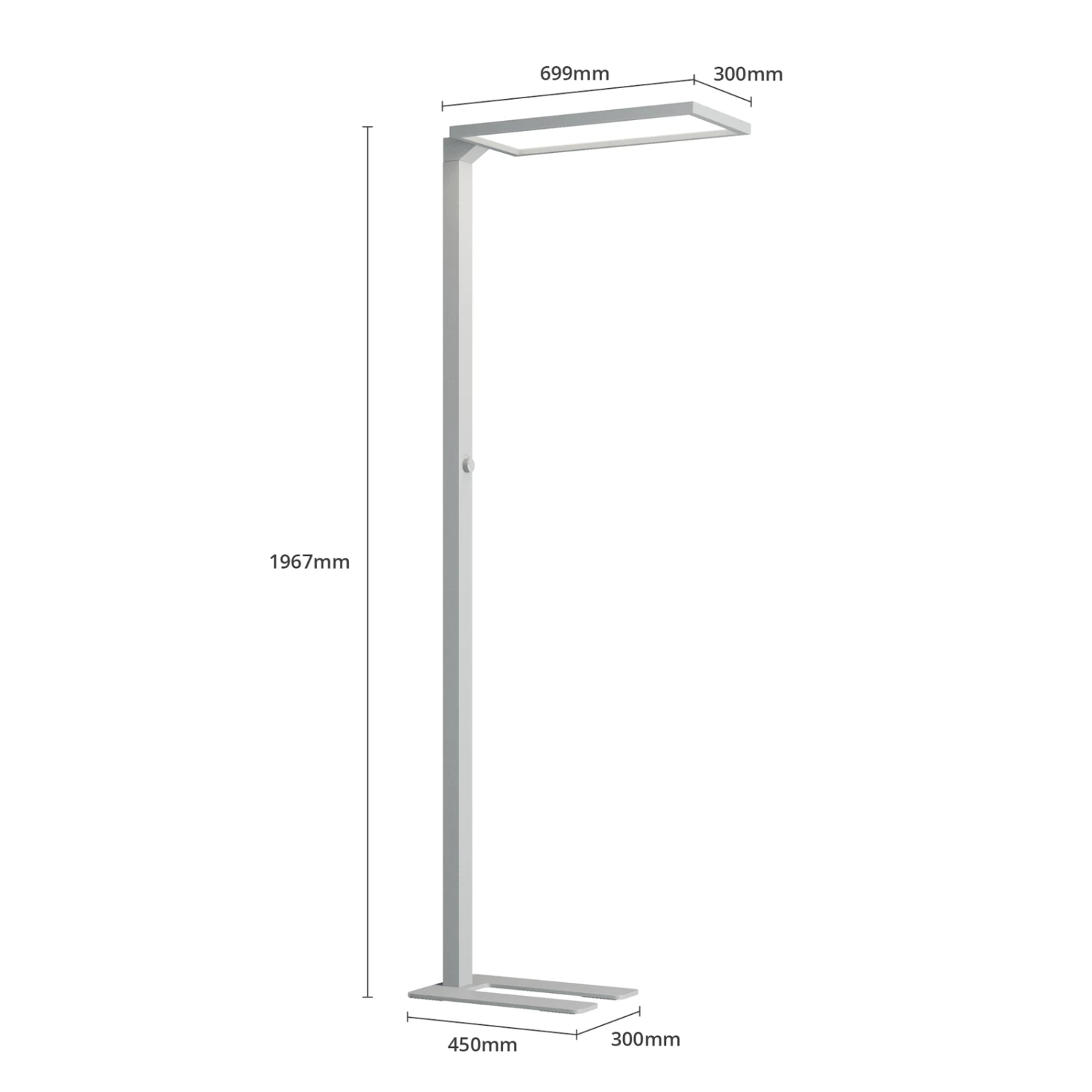 Silberne LED-Office-Stehlampe Lexo mit integriertem Dimmer und direkt-indirektem Lichtschein
