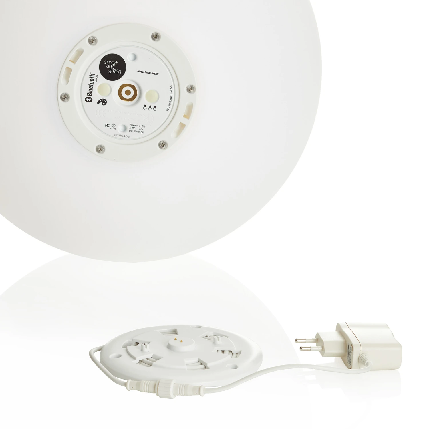 Farbige und auch weiße Beleuchtung bietet die LED-Dekorationsleuchte Ball, die sogar schwimmen kann und bedenkenlos auch im Pool oder Teich platziert werden kann. Sie wird mit einem Akku betrieben und erlaubt dadurch absolute Flexibilität ohne störendes Kabel. In der niedrigsten Helligkeit illuminiert der Ball bis zu 24 Stunden lang den Außenbereich, ehe der Akku an der mitgelieferten Ladestation wieder aufgeladen werden muss. Wer möchte, kann die Dekorationsleuchte über ein Smartphone oder Tablet bedienen. Dies funktioniert über Bluetooth mit der kostenlos erhältlichen Smart & Green App. Unzählige Lichtszenarien lassen sich so realisieren. Auch ohne Smartphone oder Tablet lässt sich die Leuchte steuern, und zwar über die Bedientasten am Boden der Leuchte. Auf diese Weise lassen sich 7 verschiedene Lichtfarben, 3 Lichtmodi und die Lichtintensität in drei Stufen einstellen.