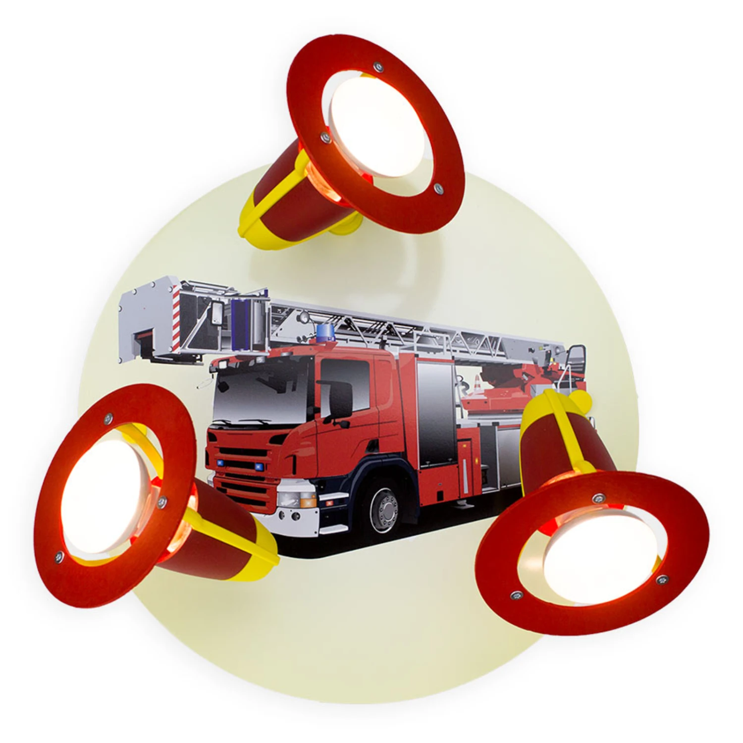 Die Wandleuchte Feuerwehrauto ist ein rundes Wandrondell mit drei beweglichen Spots, die den Raum optimal ausleuchten. Zentrales Element der Leuchte ist das Bild eines Feuerwehrautos auf gelbem Hintergrund.